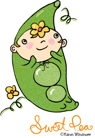 In honor of the new garden, I thought I’d illustrate one of the veggie babies. This is Sweet Pea. My idea was to draw the baby wearing a pea pod shaped sleep sack. I think it turned out pretty well, but let me know if it’s confusing. This was one of the more obscure ones…