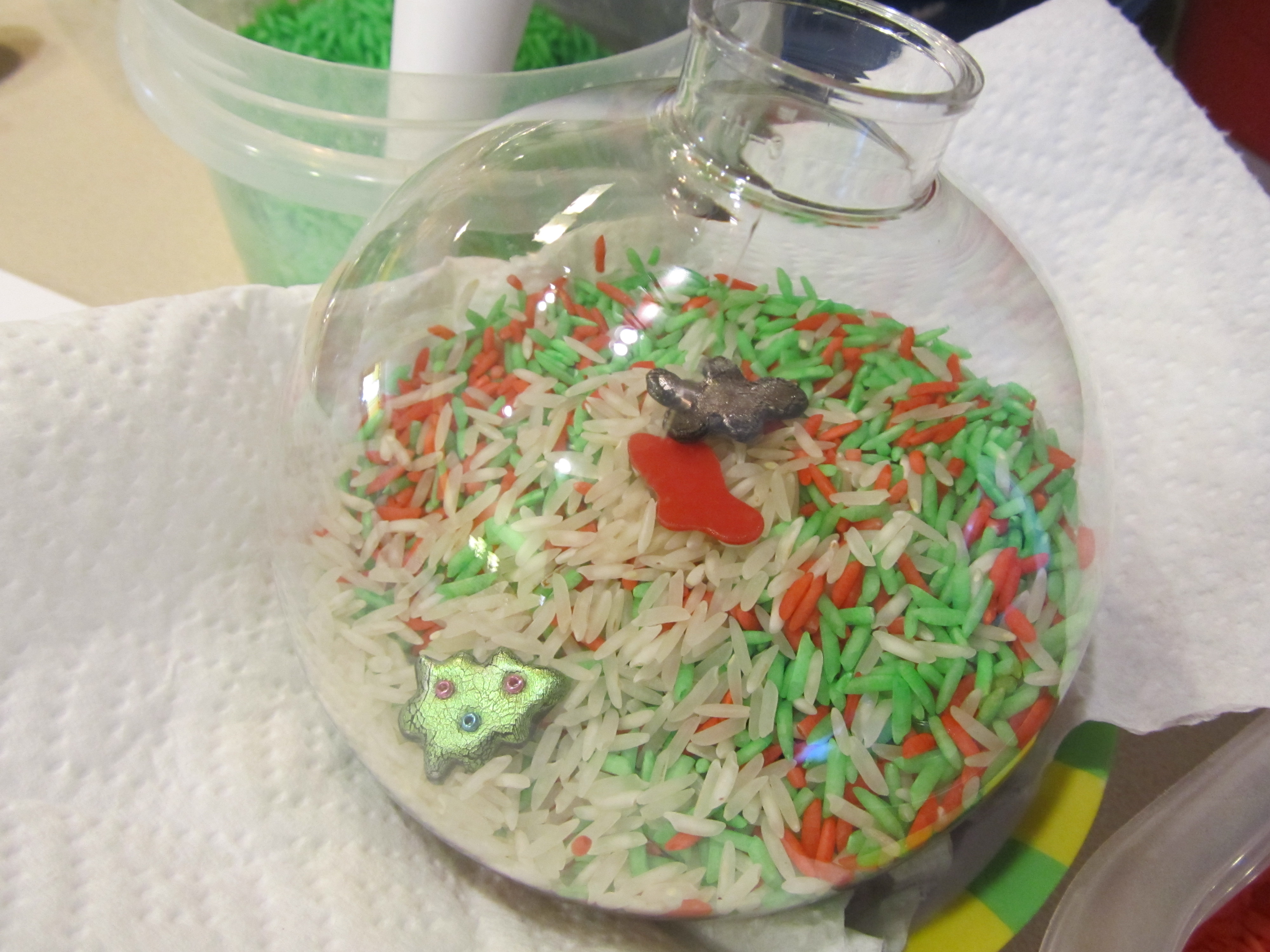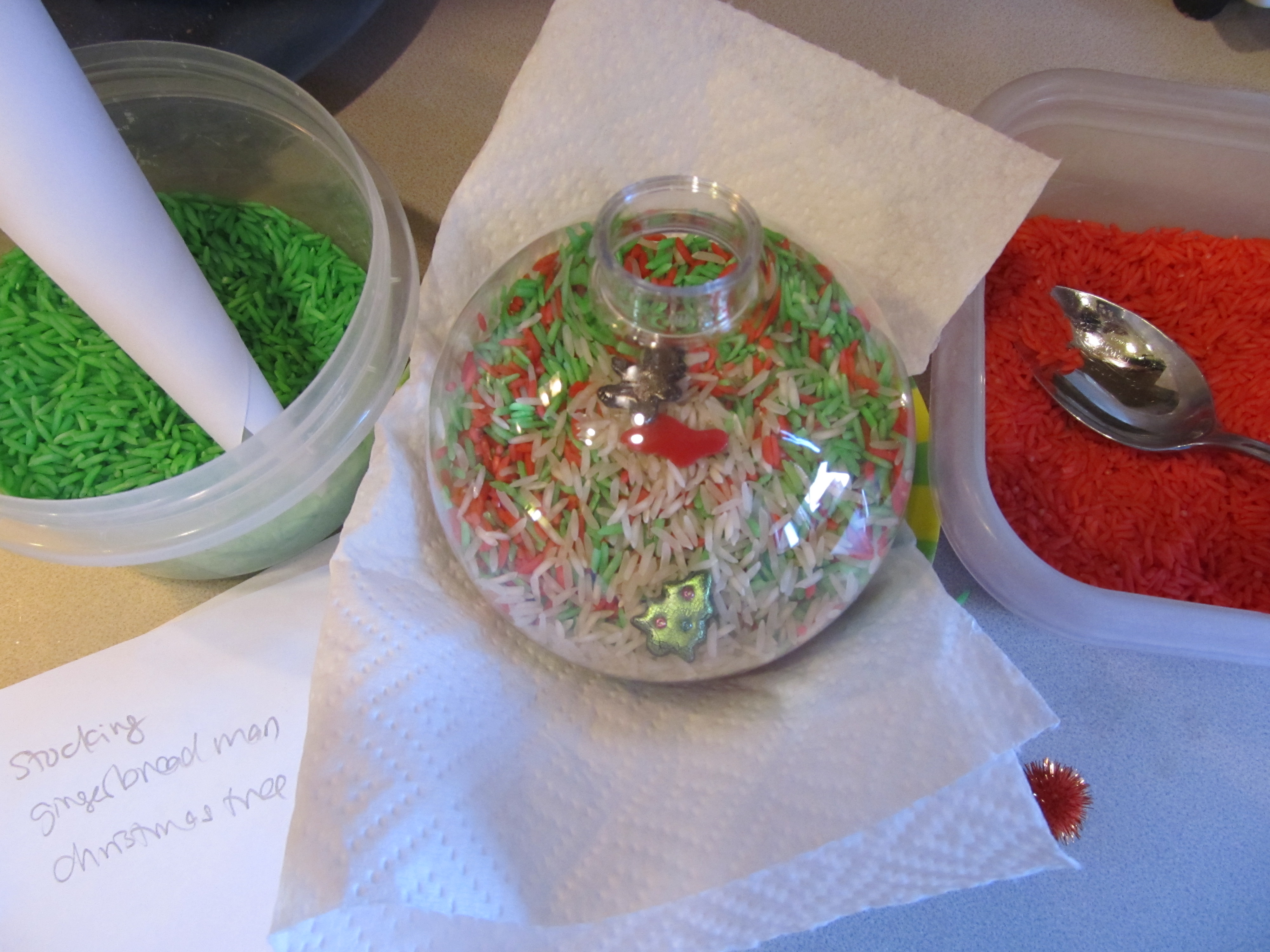 Instructions: Make a funnel out of paper and pour a mixture of the colored rices into the bulb. Be sure to leave space at the top of the bulb instead of filling all the way. Add small items. Use a hot glue gun to secure the “lid” to the bulb. Embellish with ribbon. Let the kids shake and find!