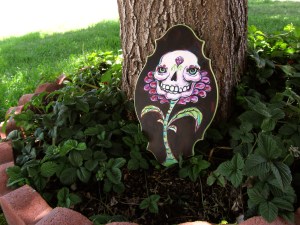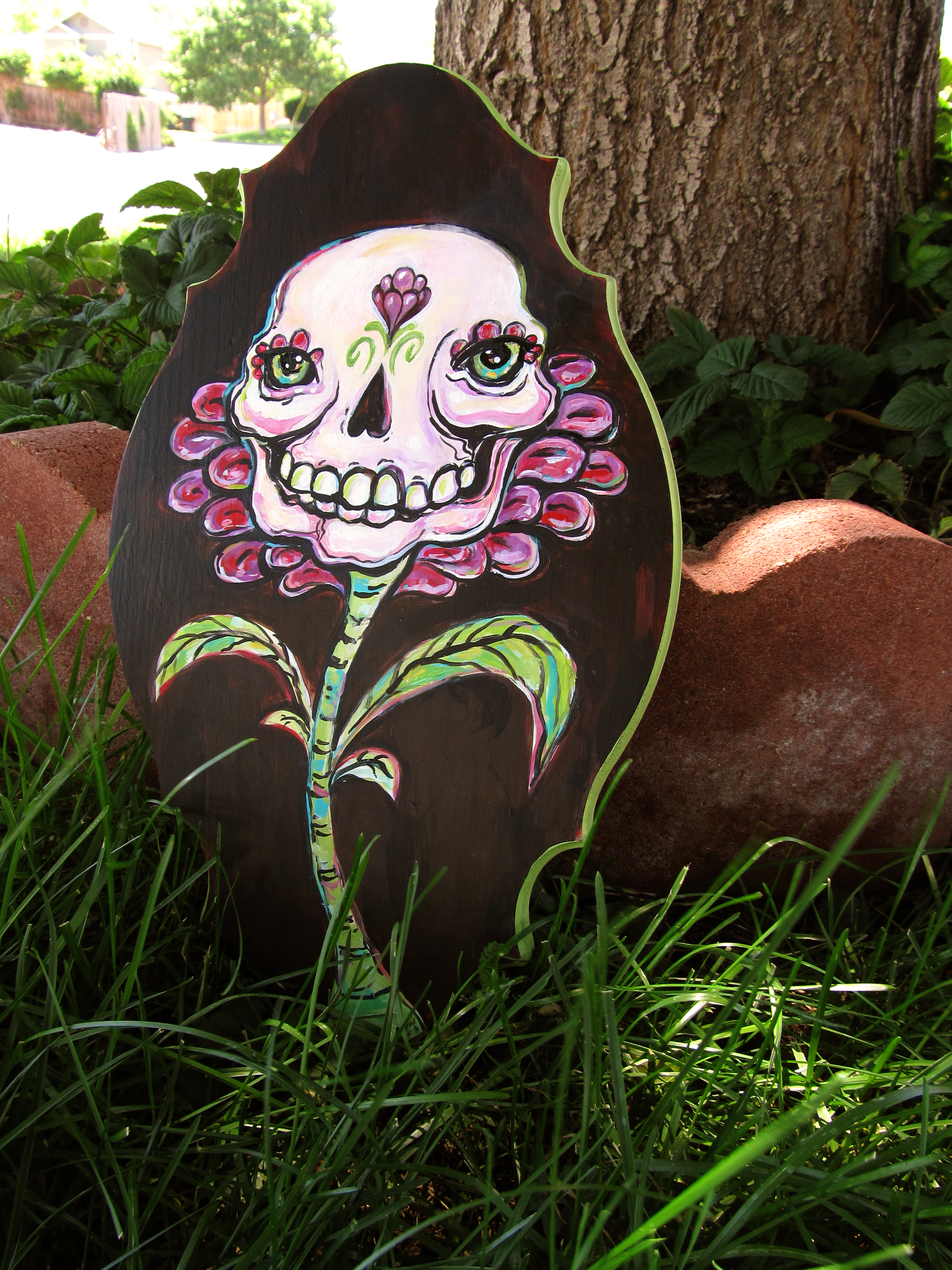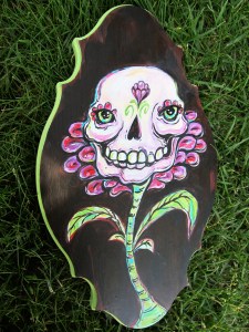 This painting was inspired by the idea of the cycle of life — death as the inevitable conclusion to life and life springing from death. I’ve also become fascinated with tattoo artistry and flowers and skulls are common images.