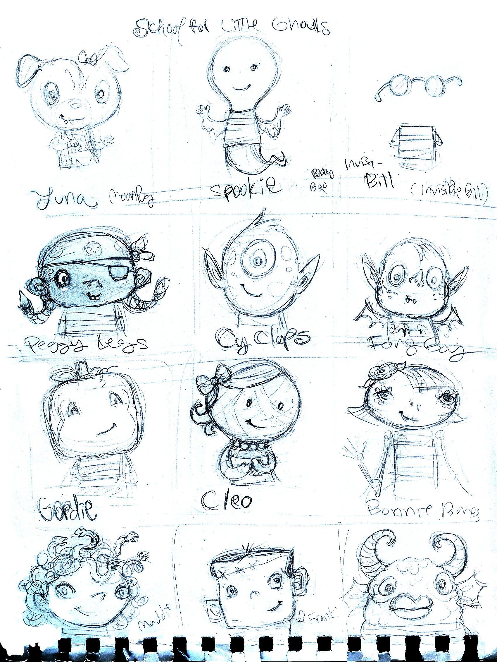 I’m trucking on through the dummy book for Gordie, and thought I’d share some character sketches. Here is my end paper concept, a yearbook-style page of photos. I’ll probably throw in some nose picking and closed eyes, etc. … but this sketch gives a good feel for the cast.