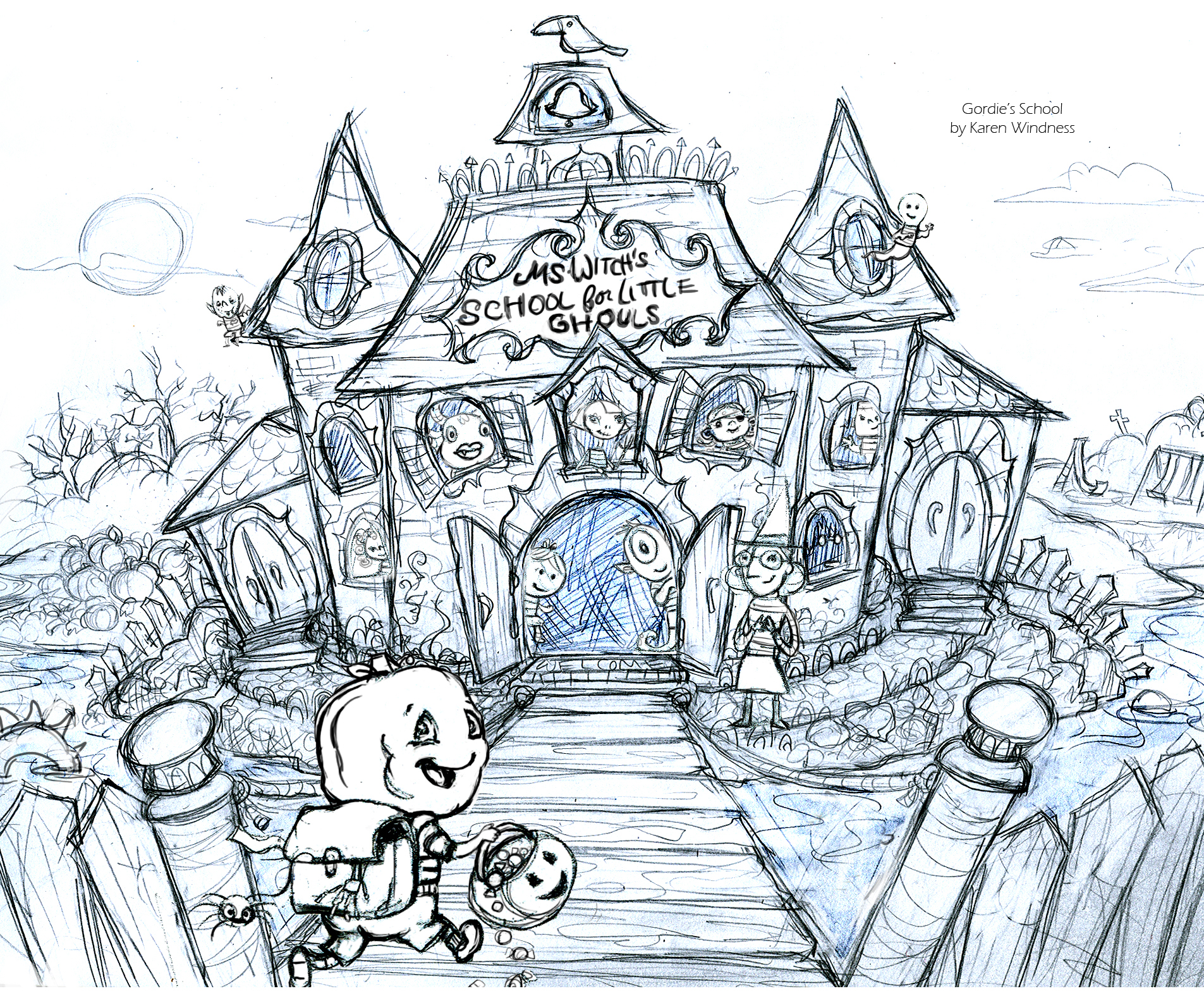This is Gordie’s school with characters added in. Gordie is excited for Halloween, can you tell?