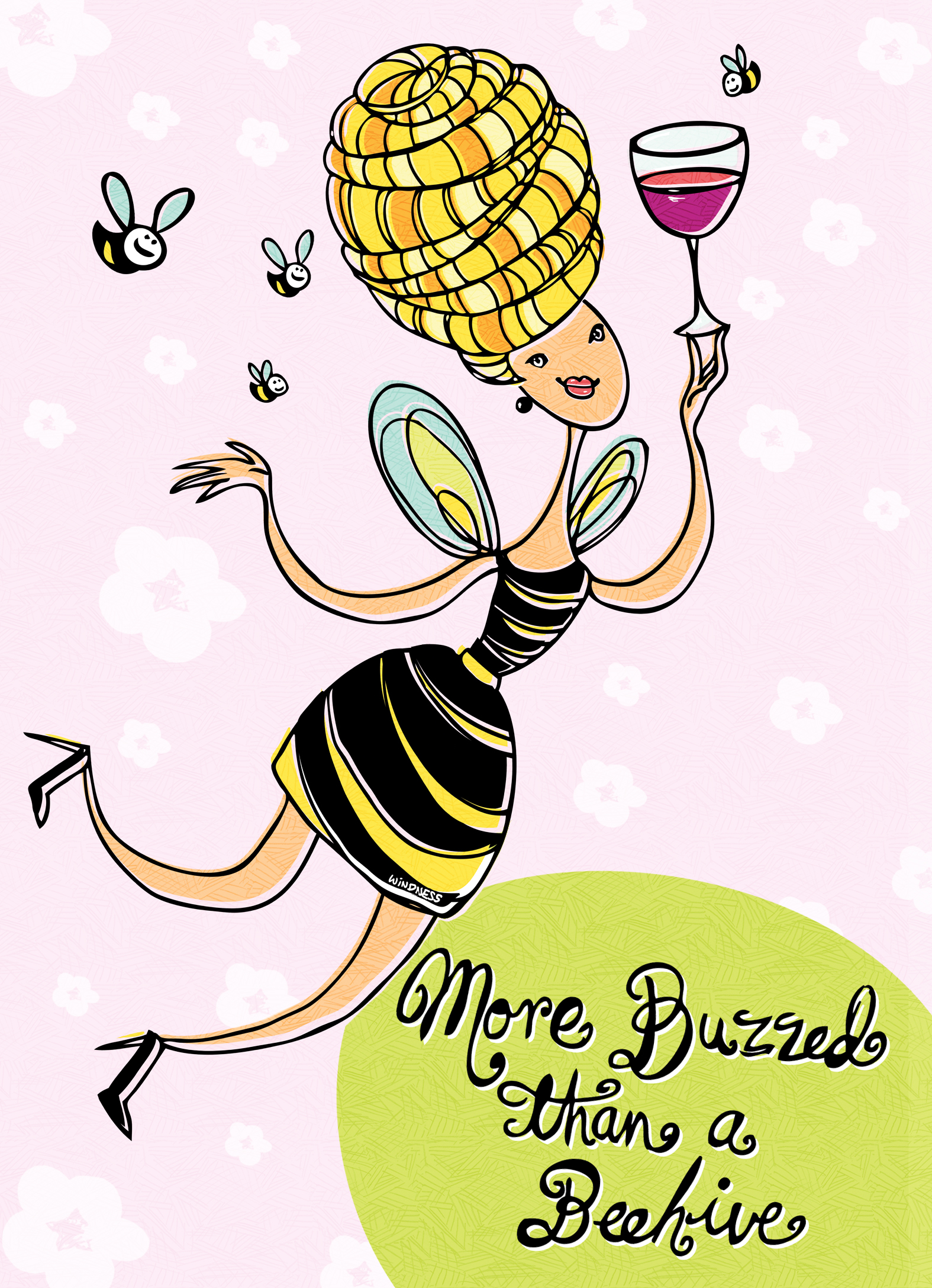 The story behind this is that I have a friend who LOVES bees. (Her last name starts with a B.) So I was listening to the radio the other day and this country song comes on and the guy is singing about bees buzzing at the screen door… and I’m thinking buzz like booze buzz, and what a fun idea that is to make the two ideas connect. And then I think about the Bublettes with the big beehive hair (another connection)… and I do a sketch. Maybe I’m trying to combine too many ideas, I don’t know. Anyhow, I made this card and I gave it to my bee-lovin’ friend for her birthday and she really liked it. So I uploaded it to Card Gnome in case you want one, too: http://cardgno.me/QCCXaL