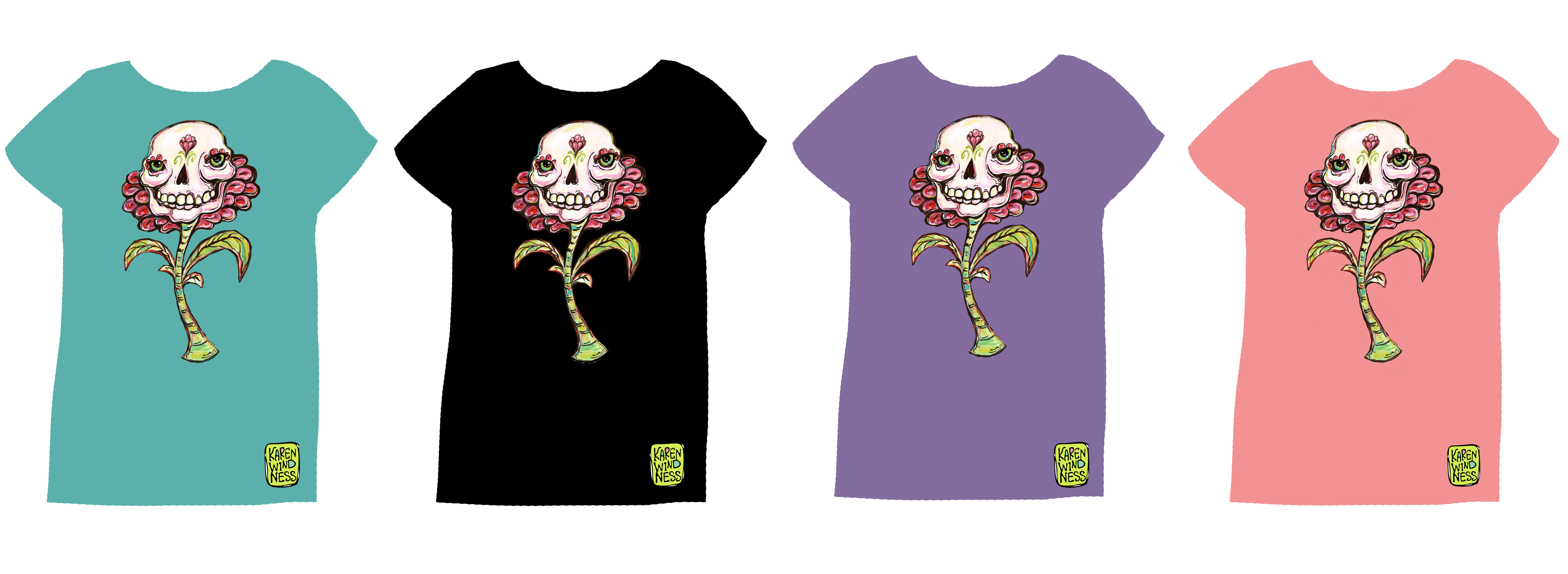 A friend from art school (The Rocky Mountain College of Art and Design) has requested Skull Flower T-shirts. I never considered putting this image on T’s, but now I want one, too! Which color would you choose? (You can click on the image to see it larger.)