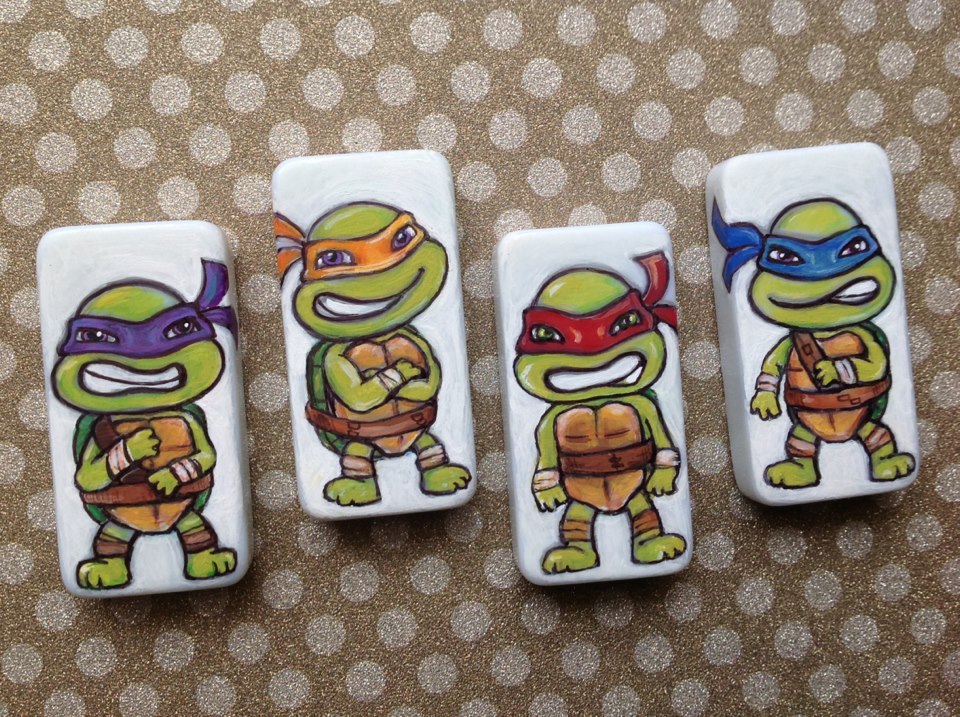 Occasionally I get special orders for something other than monsters. Like mutant turtles, for example. Which I guess aren’t monsters because, uh, they have sweet ninja skills? Anyway, here they are, heroes in a half shell… and on dominoes: Donatello, Michelangelo, Raphael, and Leonardo.