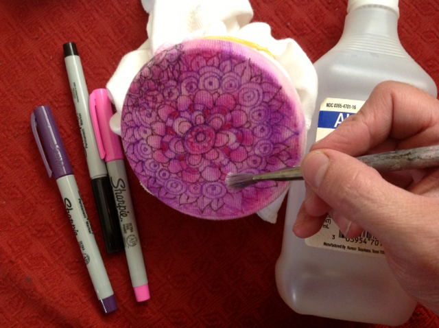 With the rubber band still in place, dip a brush in rubbing alcohol and apply to drawing. I learned that you don’t need much! It will continue to bleed for a couple minutes. Also, black seemed to stay put pretty well while the other colors bled out.