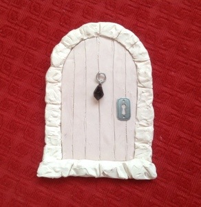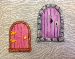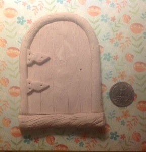 My nieces love fairies, and I know they’d love a little portal to fairy land. I made these tiny doors for them from Sculpey and painted them with acrylic paint. I pressed the clay into a piece of wood to get some texture before baking.