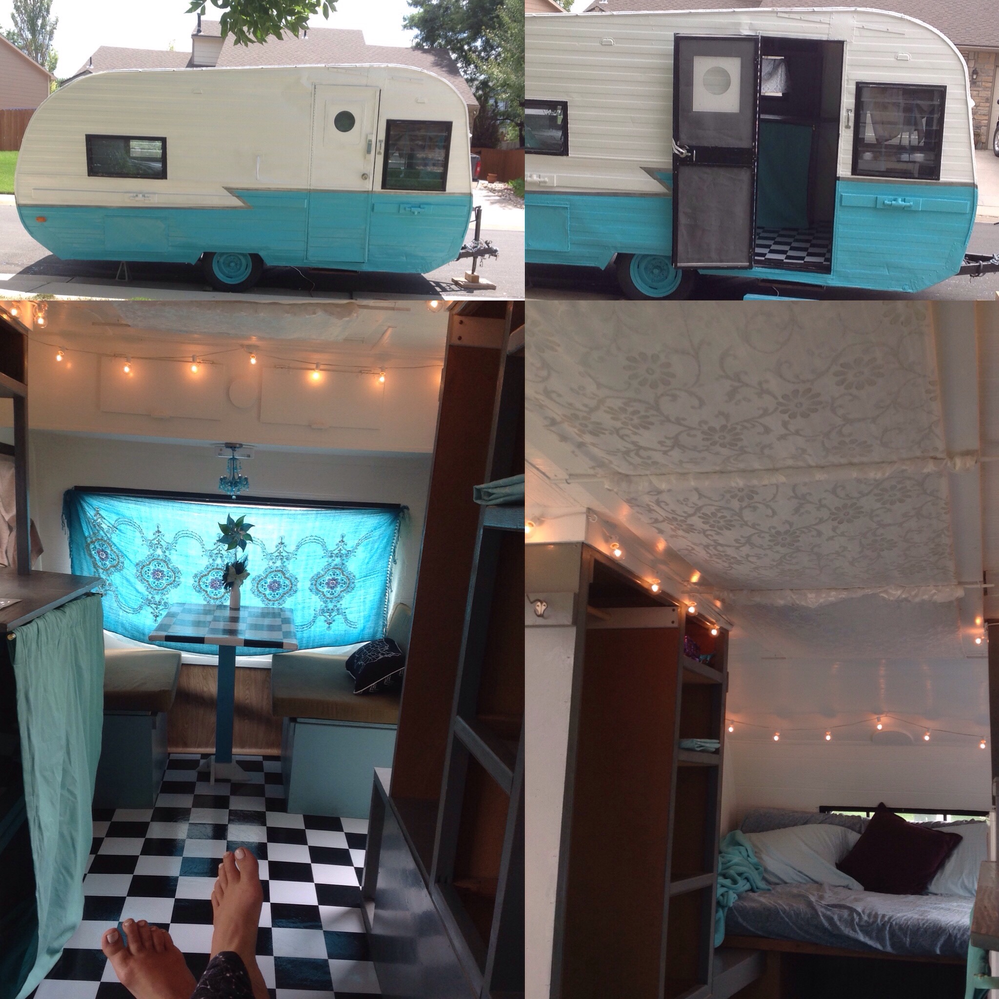 Just installed flooring! This was a peel and stick product made by Nexus, purchased through Walmart online. Fairly inexpensive. The hard part was cutting it to fit around the table and funky cabinet shapes. (I have math issues, and that’s not helpful!) There was also some adhesive residue. If you install this flooring, get some grapefruit essential oil, put a few drops on a soft cloth and wipe off the excess sticky bits. Works great. Curtains and cushions to come! – Karen