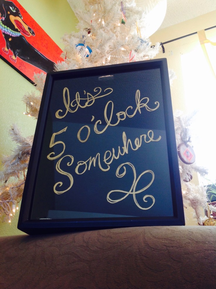 I got the idea from something similar in the Bed Bath & Beyond catalog. I actually tried to buy it in store, and they couldn’t find it on the shelves. Fortunately, I remembered I had an unused shadow box in the basement, as well as some oil based markers from a coffee mug craft that didn’t work so great (not dishwasher friendly).