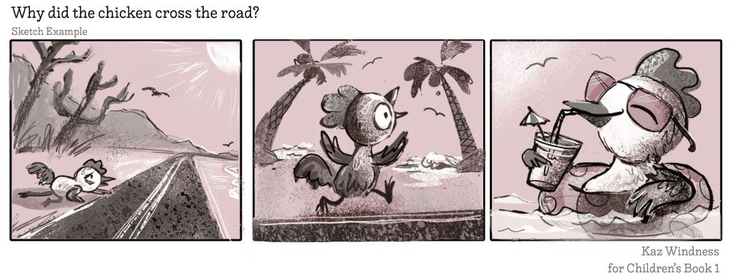 Here’s an example I just drew for my RMCAD Children’s Book 1 class. Our introductory exercise is telling a wordless story in three panels answering the question “Why did the chicken cross the road?”