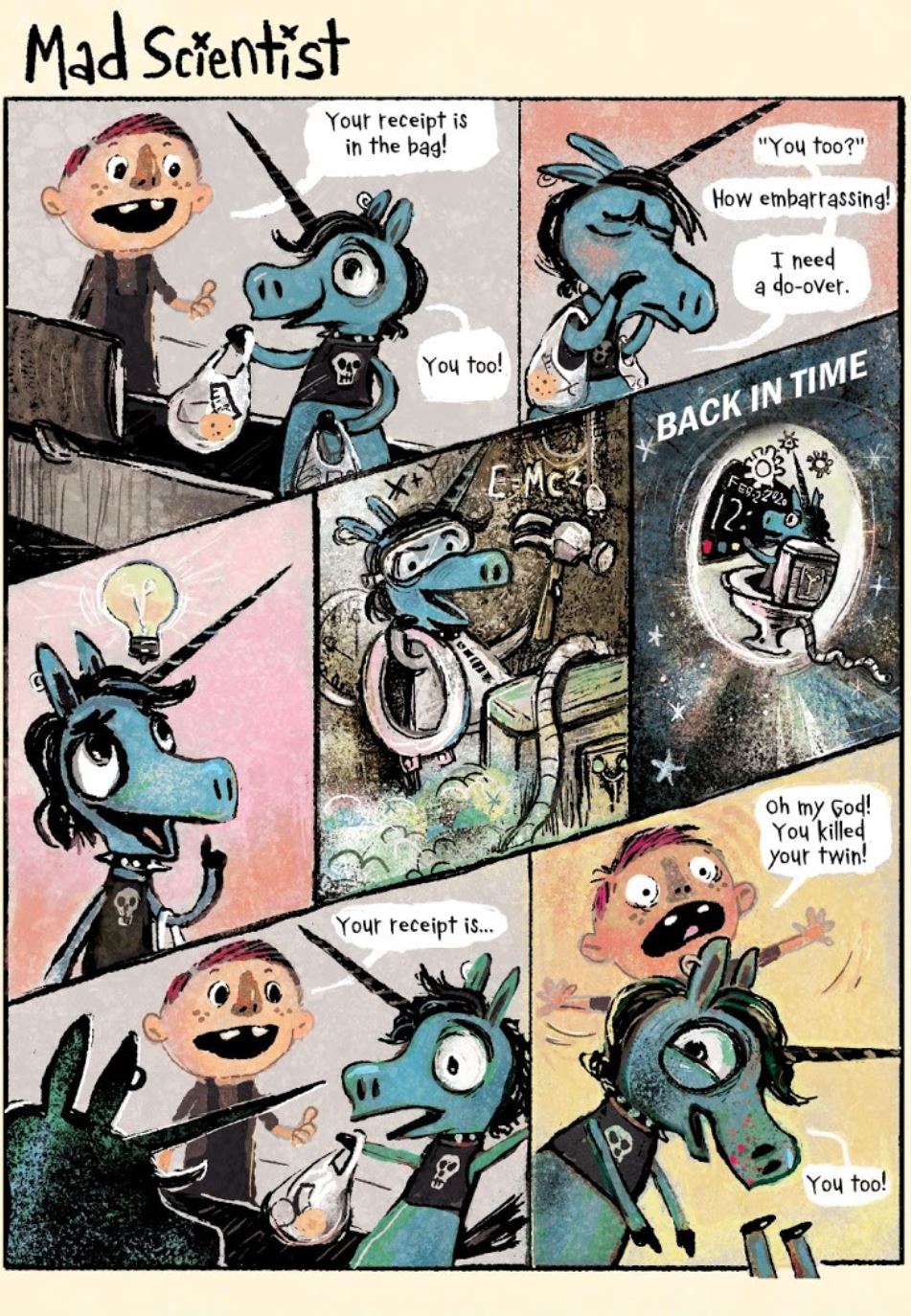 Here’s an example from my book, If UR Stabby. The beginning setup is the top row. We’ve established the problem. The second row is the middle. Stabby has come up with a way to accomplish the do-over he so desperately wants. He executes his plan. The bottom row shows the solution, which is maybe not what we thought it would be. Stabby is his own worst enemy– literally!