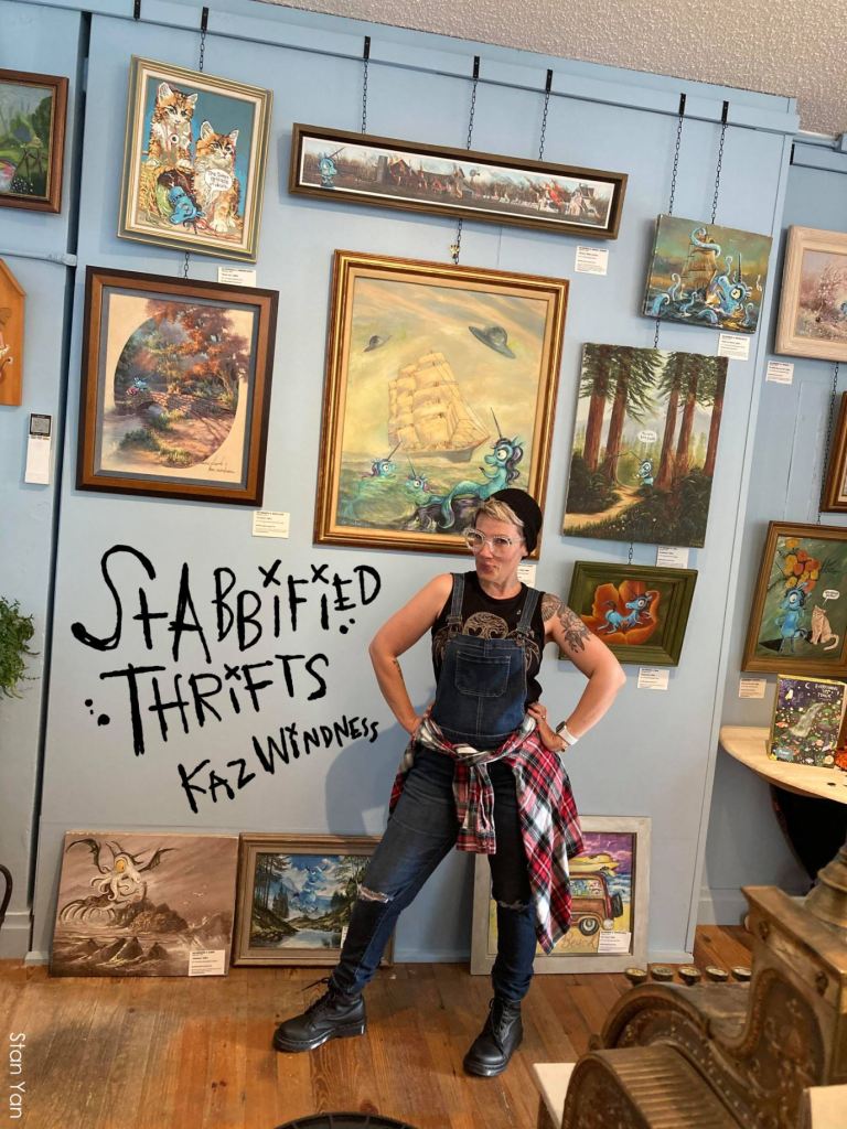 The STABBIFIED THRIFTS show is up now at The Wandering Jellyfish Bookshop. The show culminates with an “If UR Stabby” book party and signing October 30th, 2021 at 4pm. Stop by if you can!