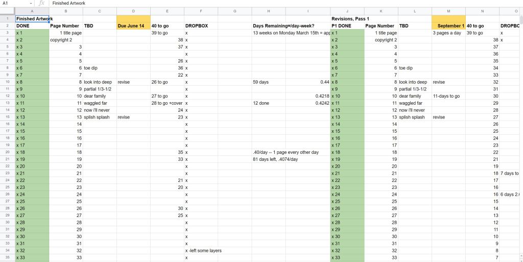 As far as scheduling yourself, I divide the number of pages of illustrations, including the cover, by the amount of time I have before the deadline. I will know that I need, for example, three finished pages of illustration every week. I “X” out my finished illustrations and color code green, and that gives me a sense of accomplishment. If I can get ahead on some of them, it gives me more time to finish the harder paintings. I habitually leave the harder art for last, but I don’t recommend that. You have less energy at the end. Illustrating a book is an endeavor. Start with some easier ones to get your confidence and style direction, but then dig into those complicated spreads. If you are doing your own project, still give yourself a deadline and stick to it.