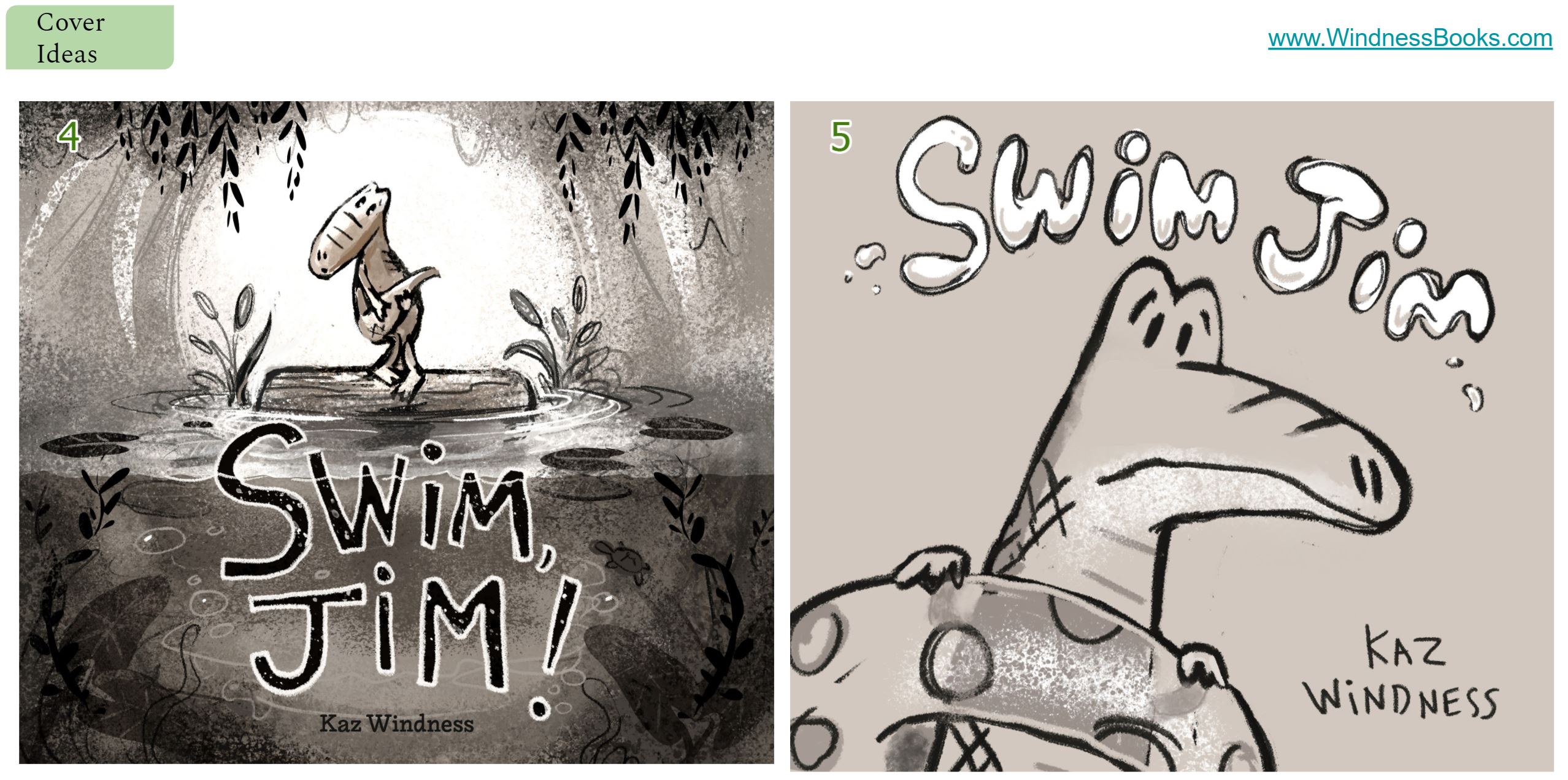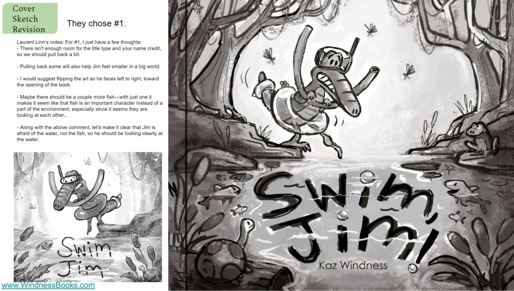 It took me a couple weeks to figure out the story and a few weeks more to create a mockup line drawing version of the book called a dummy book. With the dummy book, I created some art samples including what the cover might look like. The original title was JIM CAN’T SWIM.