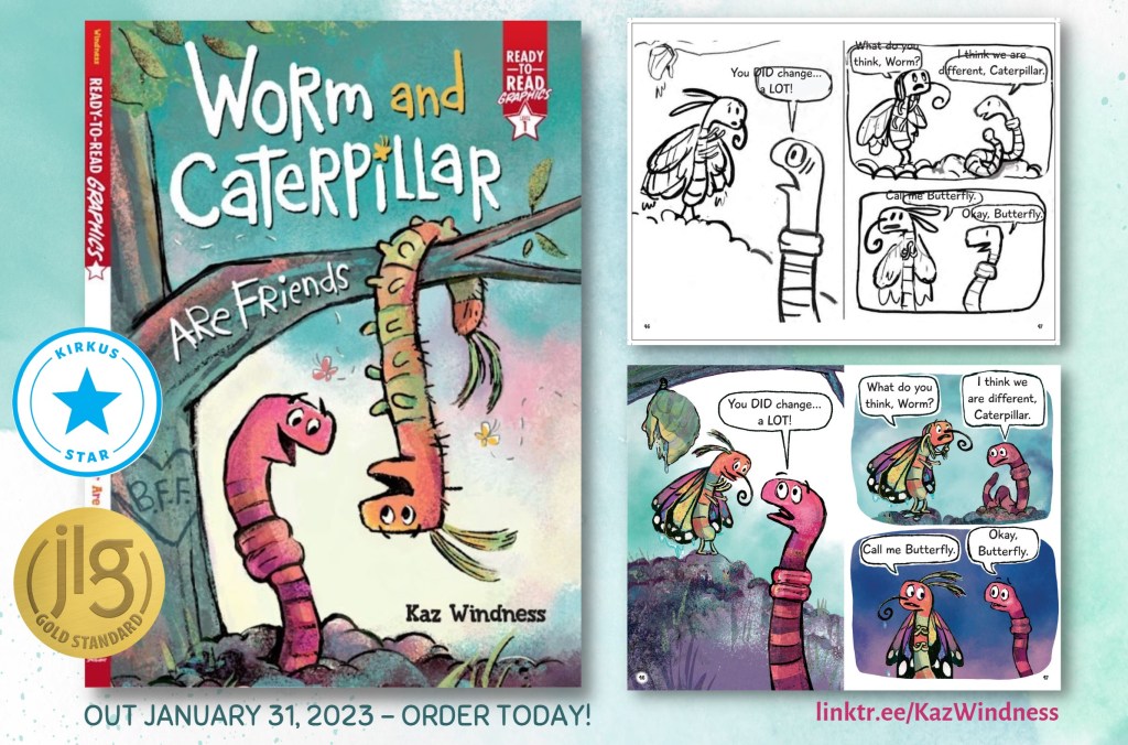 Hello #KidLitPostcard day! I’m Kaz, an #autistic #ADHD #writer #illustrator #educator living in Denver, Colorado. I especially love illustrating #SEL picture books with inclusive themes. Here’s a sketch-to-final sample from WORM AND CATERPILLAR ARE FRIENDS out this month with Simon Spotlight/Simon & Schuster! Book links here! https://linktr.ee/KazWindness