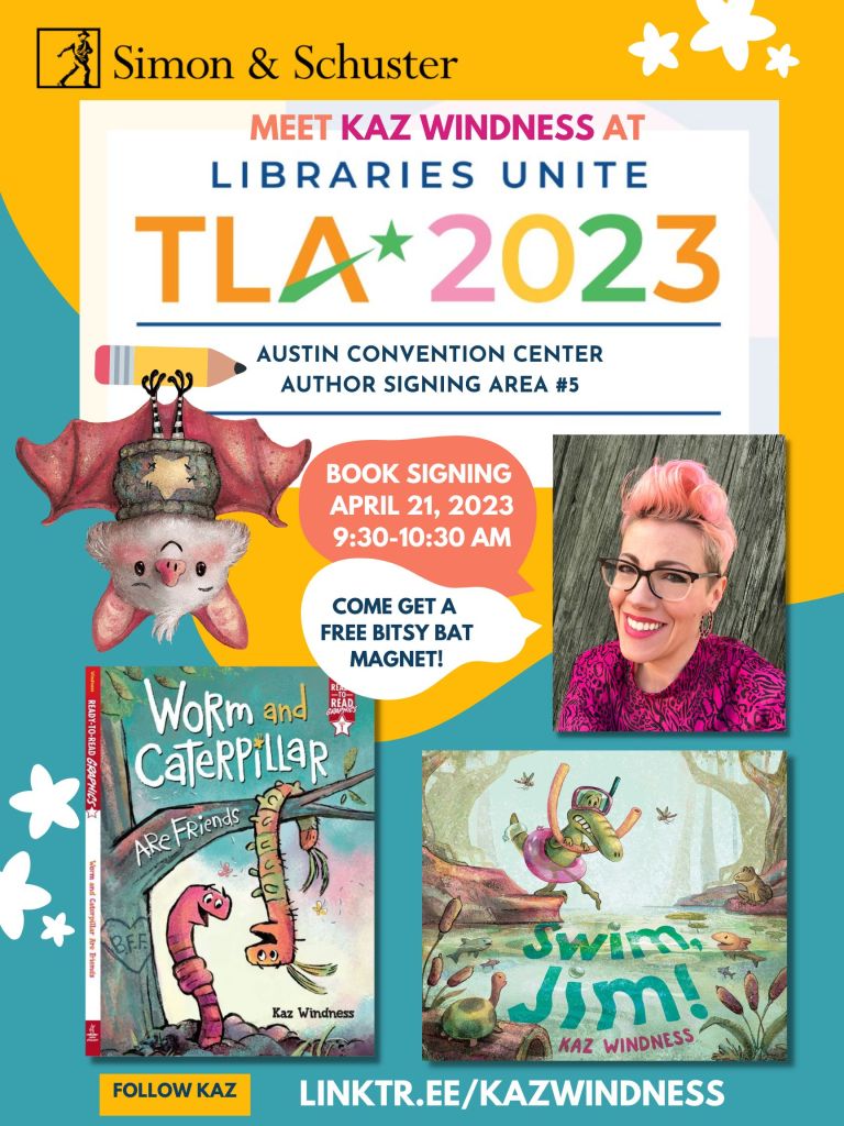 Are you going to Texas Library Association in April?! If so, come say hi! This is my first library conference and I’m super excited to meet #librarians and #educators and all the wonderful book people and sign and doodle “Swim, Jim!” and “Worm and Caterpillar are Friends” and introduce you to BITSY BAT, SCHOOL STAR and CAT VS. VAC SimonKIDS. More info to come! #TLA2023 #TLA #kidlit #kidlitart