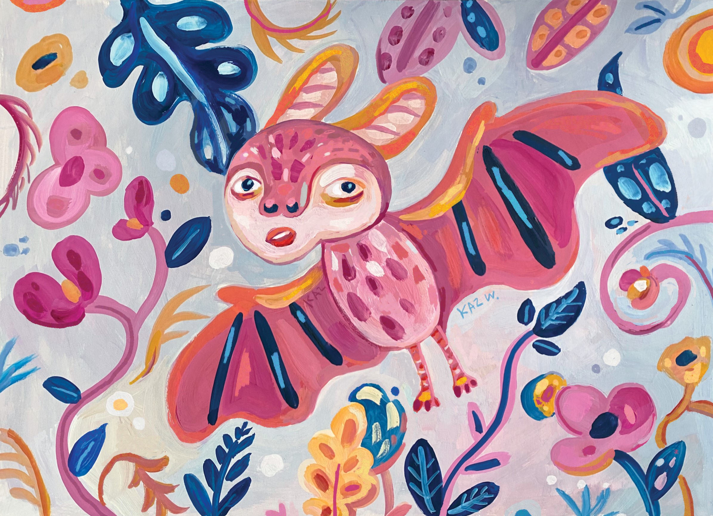 Exploring another medium and style, but a favorite topic. This is a pink bat in gouache. Merch here!: https://www.redbubble.com/shop/ap/141479695?ref=studio-promote