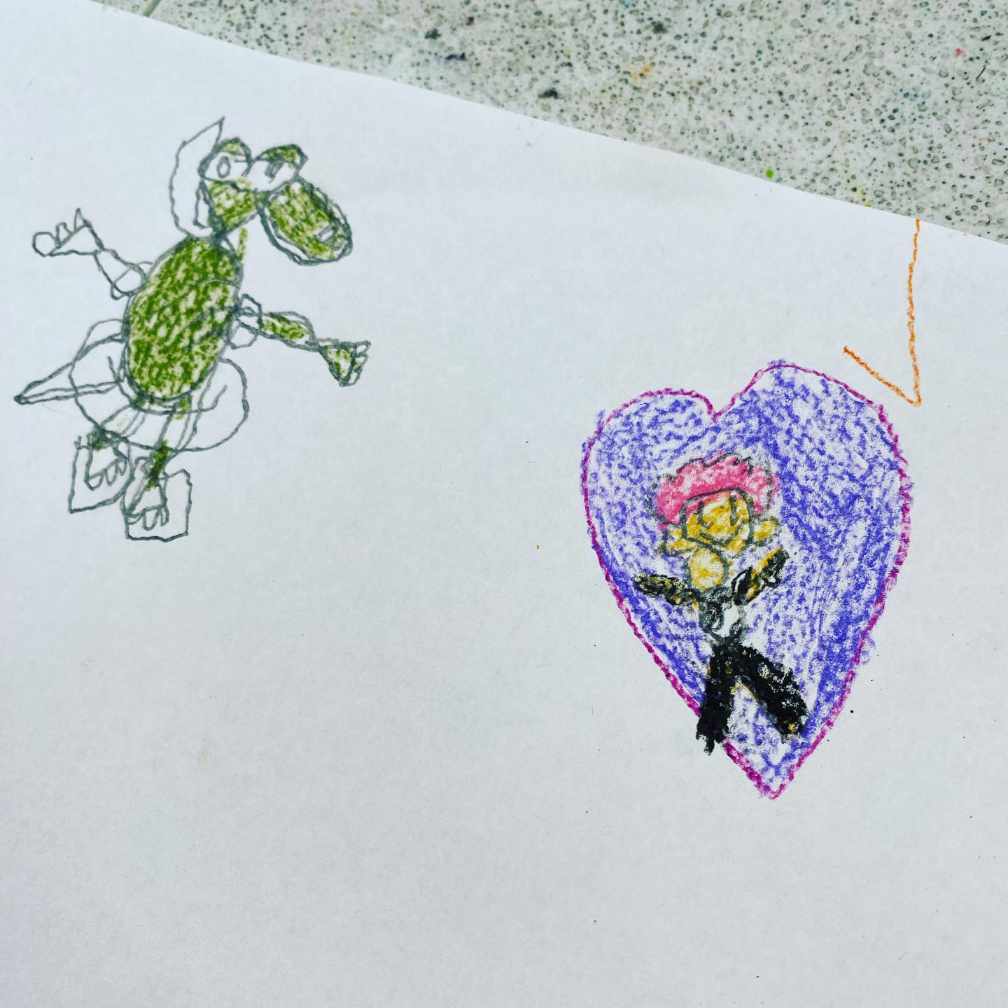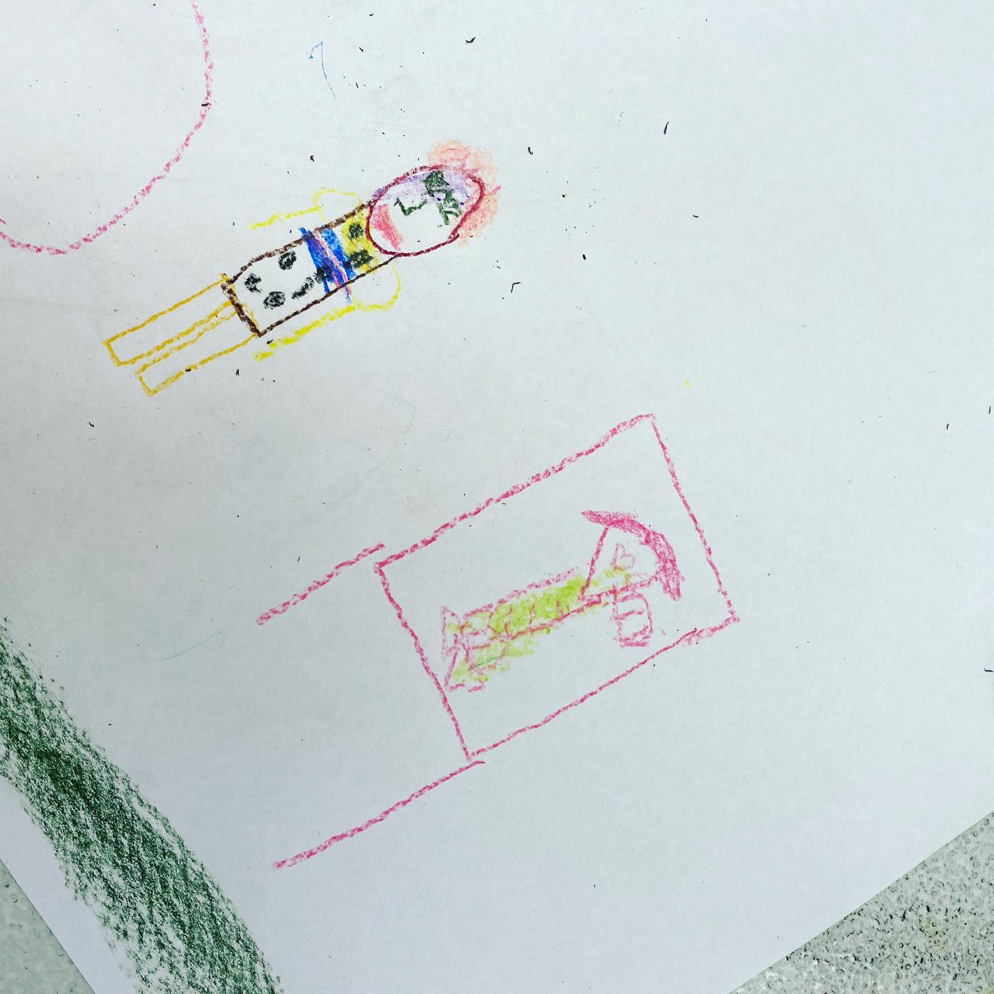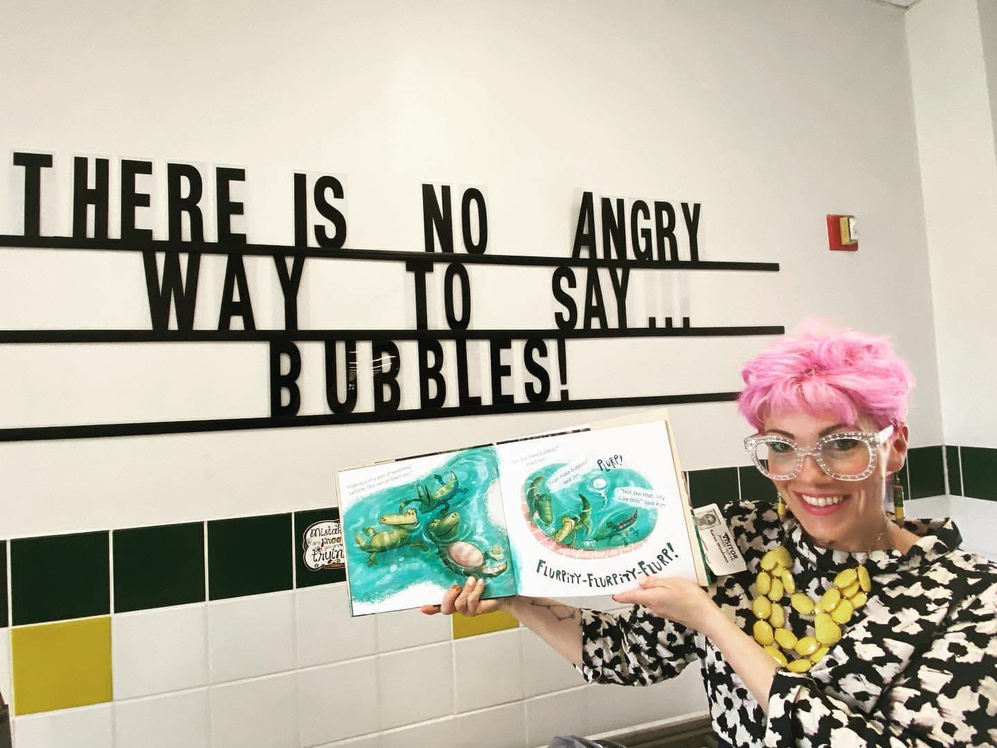 Later that morning, I met with two adorable elementary art school classes. We read “Swim, Jim!” and drew a character from simple shapes. The kids decided I was a character, too!