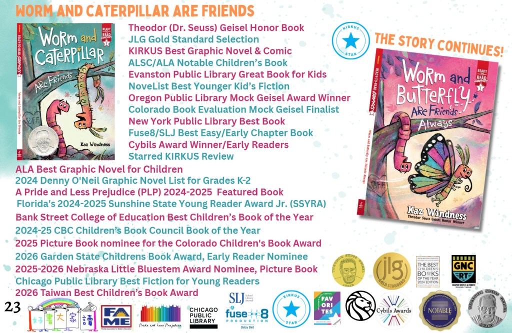 UPDATE! Both Oregon and Chicago, Illinois library systems have tapped “Worm and Caterpillar are Friends” as a Best of 2023 Book! Chicago Public Library’s Best of the Best Books of 2023 (#cplbest) HERE