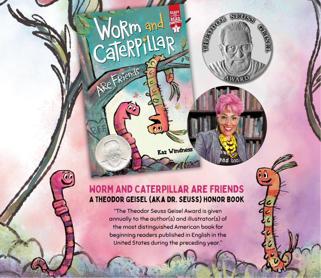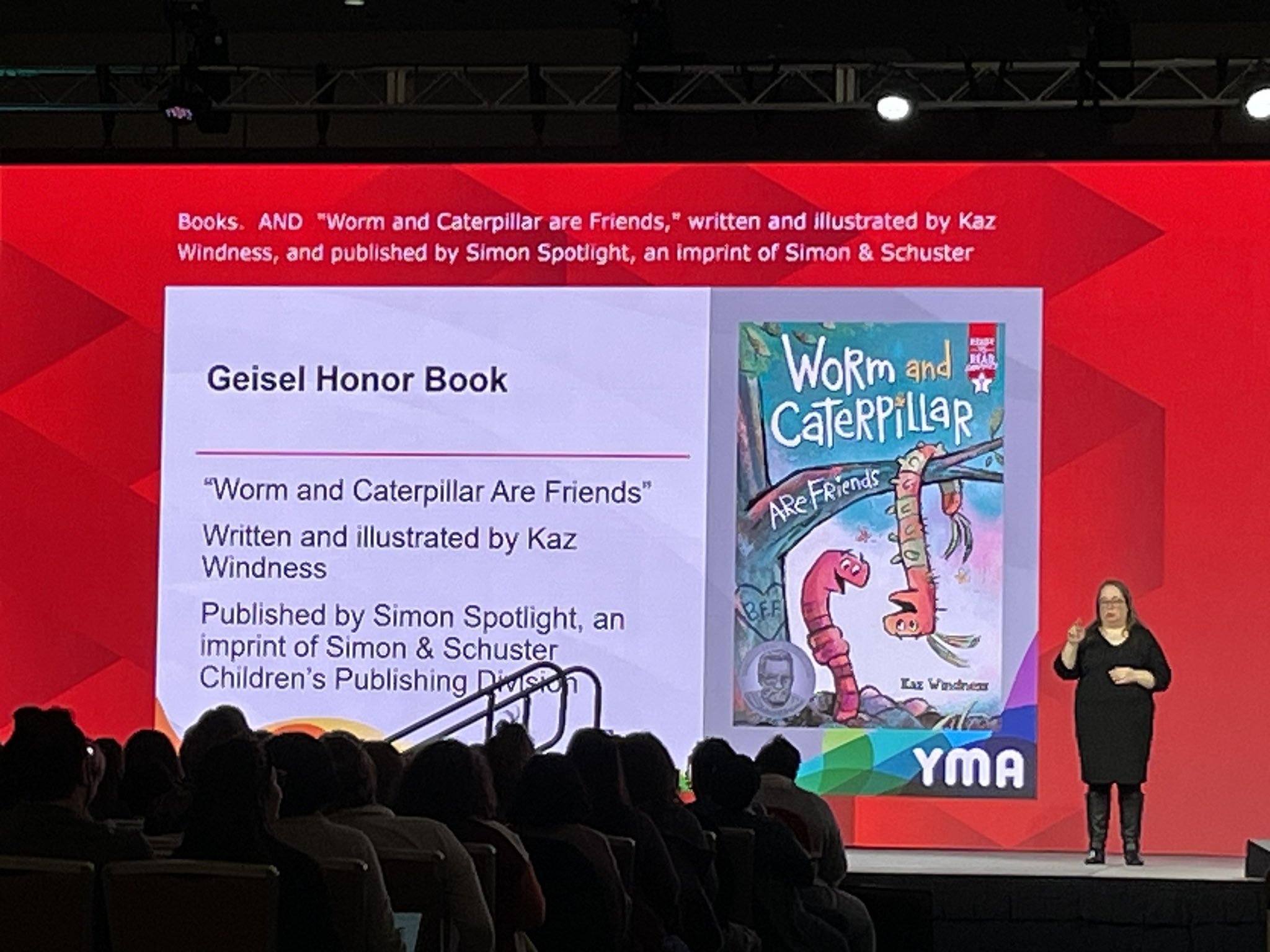The butterfly is out of the chrysalis! This morning at the American Library Association Youth Media Awards ), “Worm and Caterpillar are Friends” was named a GEISEL HONOR BOOK…. an honor “given annually to the most distinguished American books for beginning readers.”