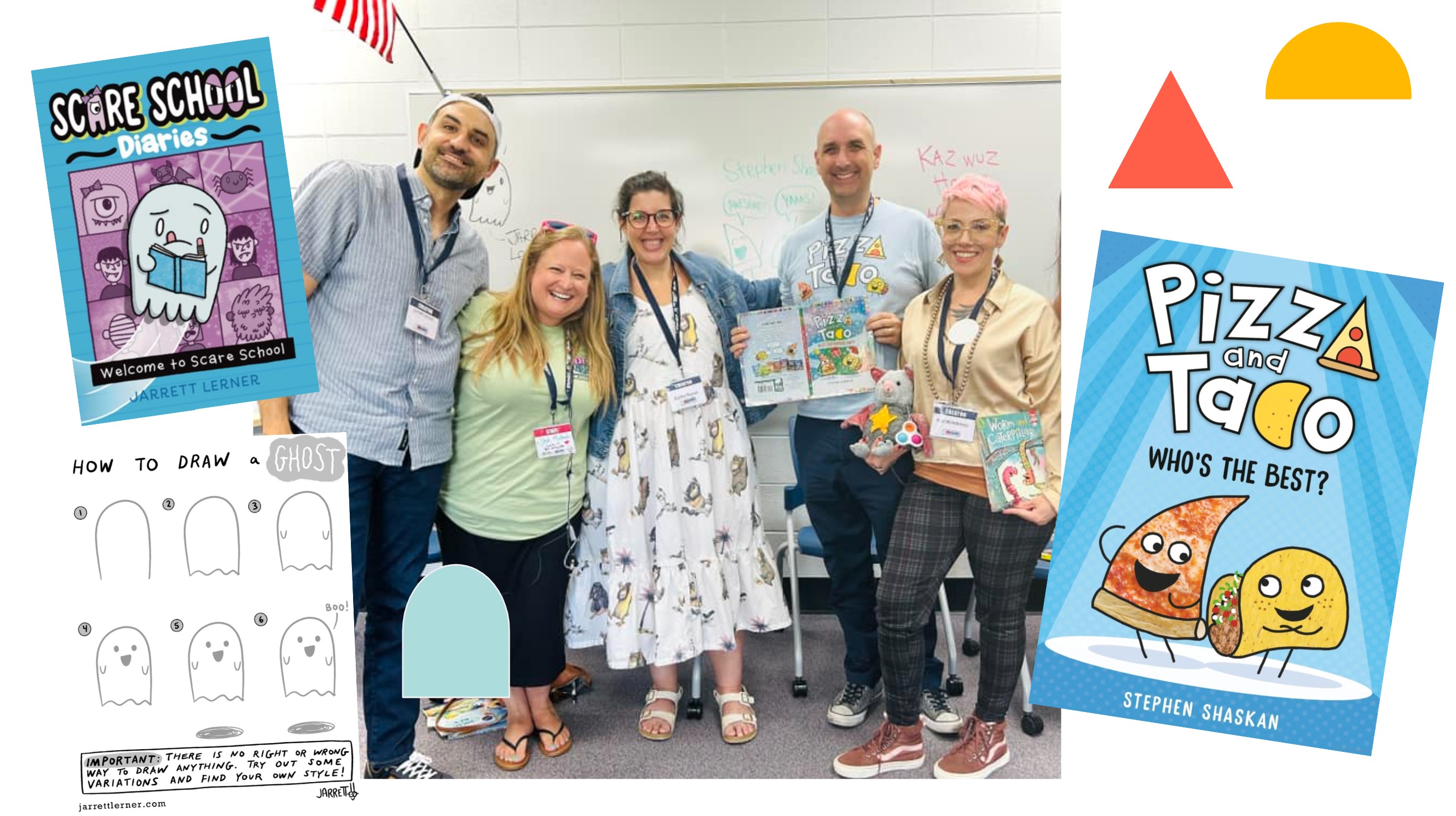 We drew Pizza and Taco by Stephen Shaskan using circles and triangles, demonstrating how a great character can be built from simple shapes. Then we drew “Swim Jim!” as a dragon using audience ideas, such as *wind power* to fly.