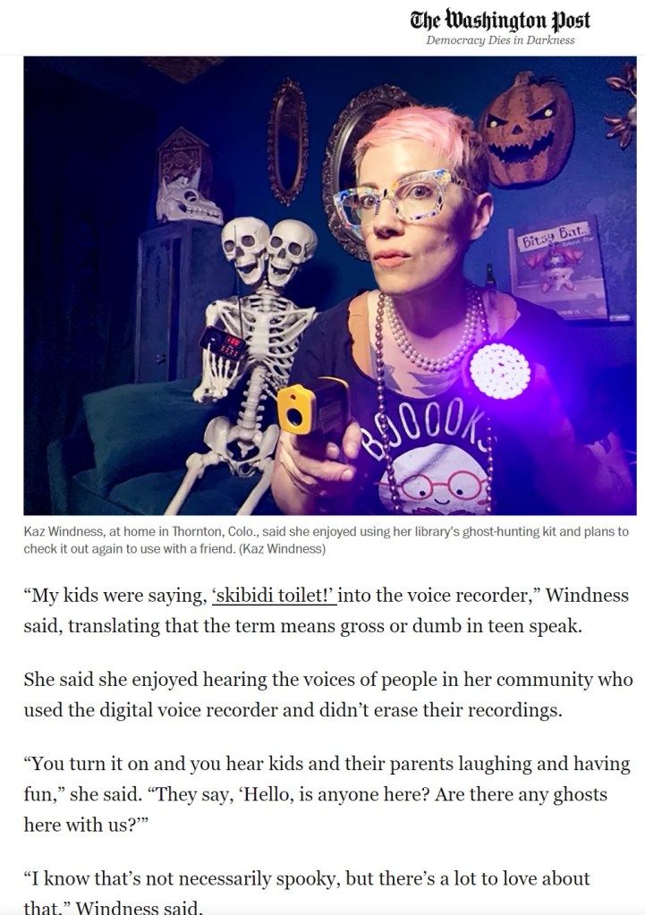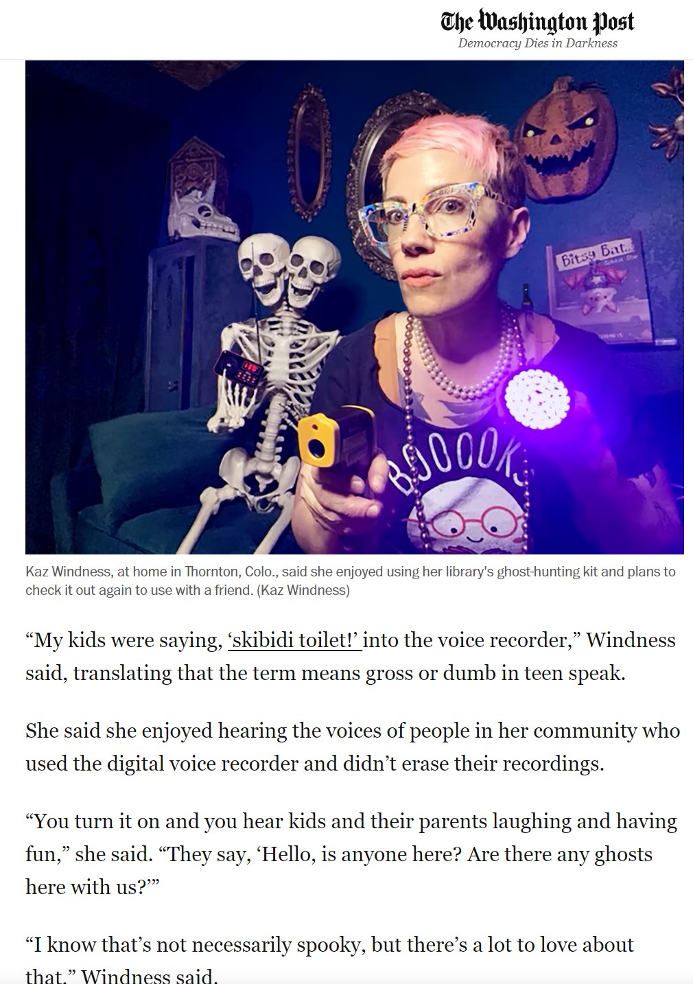 Do you believe in ghosts? I recently checked out a ghost-hunting kit at Anythink Wright Farms Library. The Washington Post picked up the ghost-hunting kit story; you can read it here… IF YOU DARE!: https://wapo.st/4dqxikM