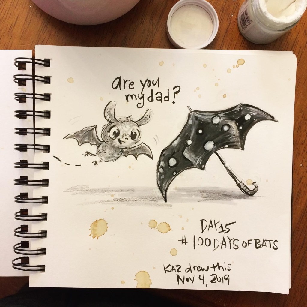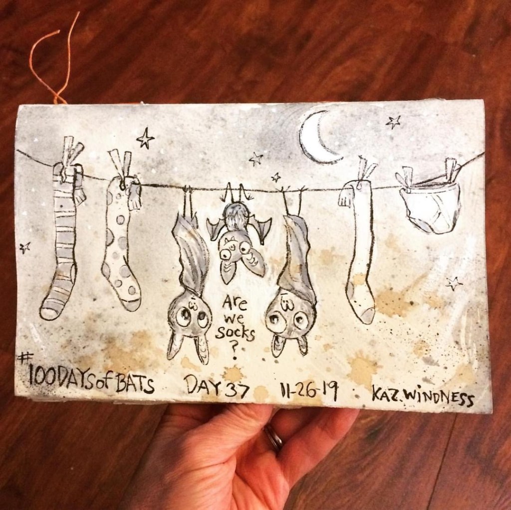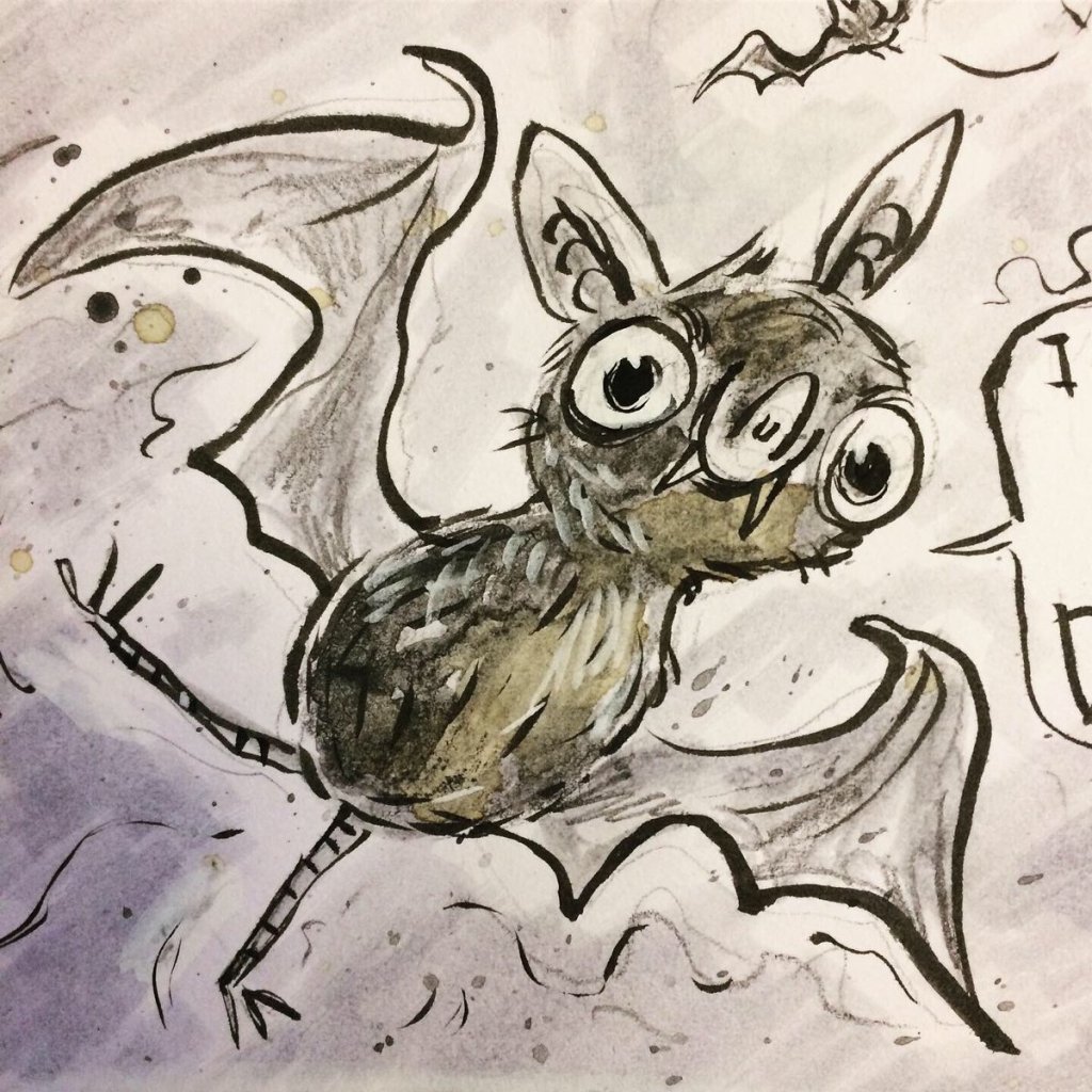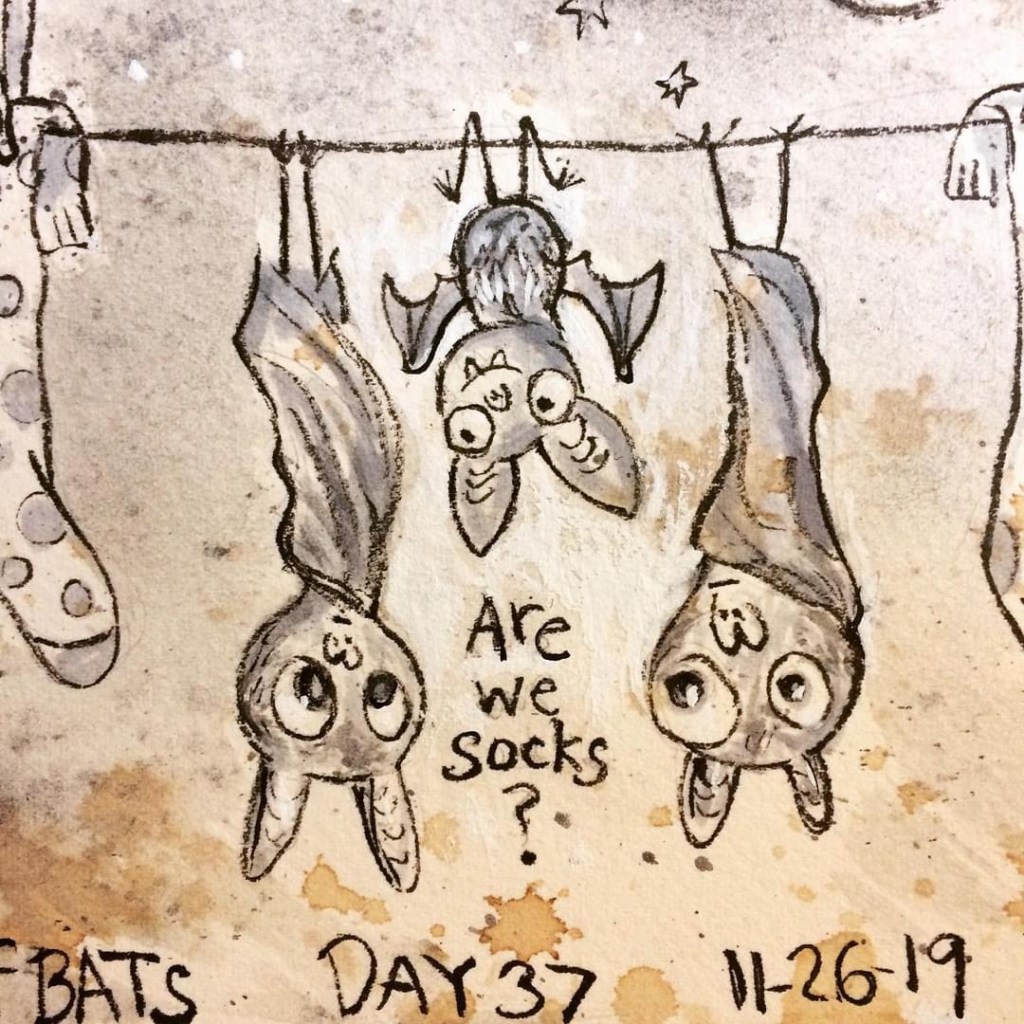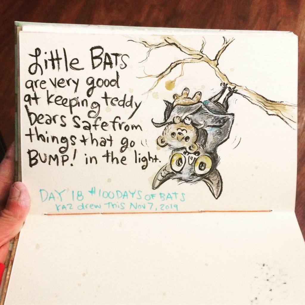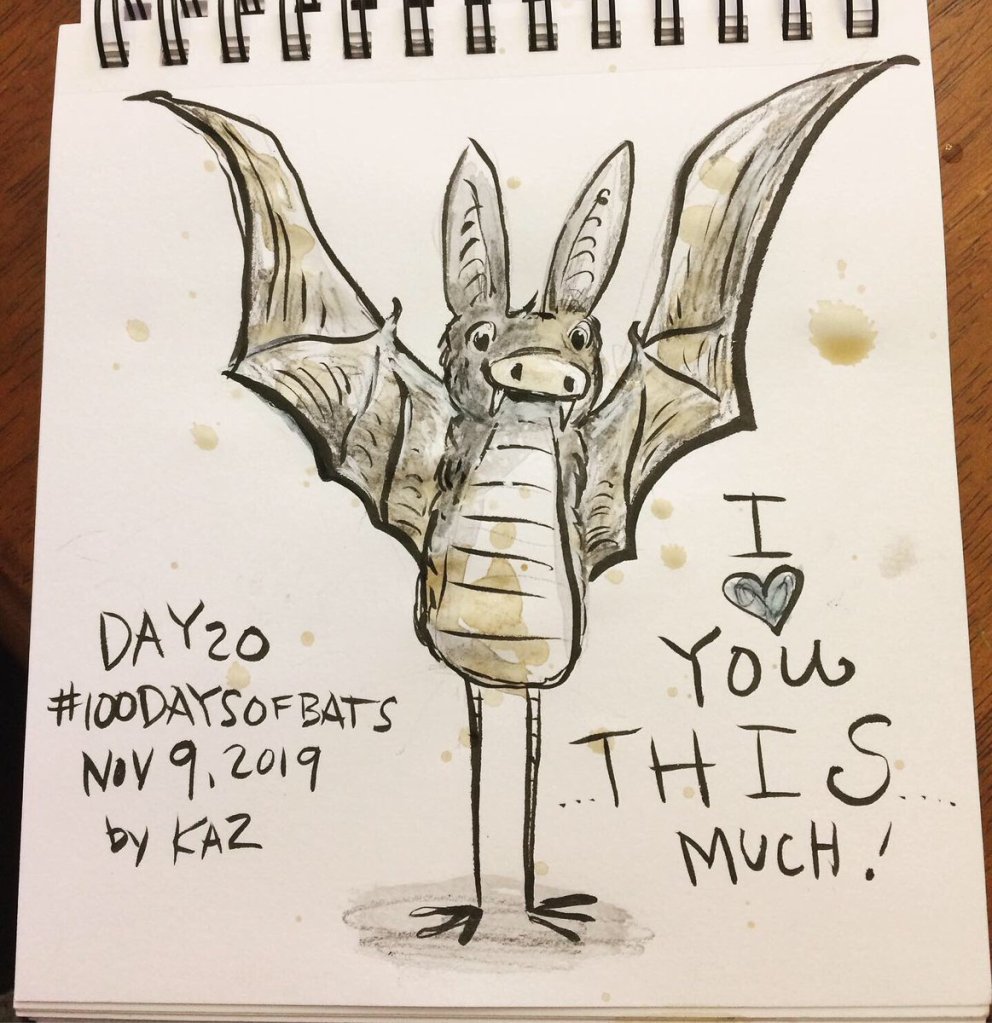 Before the “Bitsy Bat” series, I drew LOTS of bats. Here’s a #100day project I did in 2019-2020 called #100DaysOfBats. Bats are my favorite animal, and I always have ideas for them, but this forced me to dig deep and get creative. What is your favorite? Most of these are ink on Arches watercolor paper.