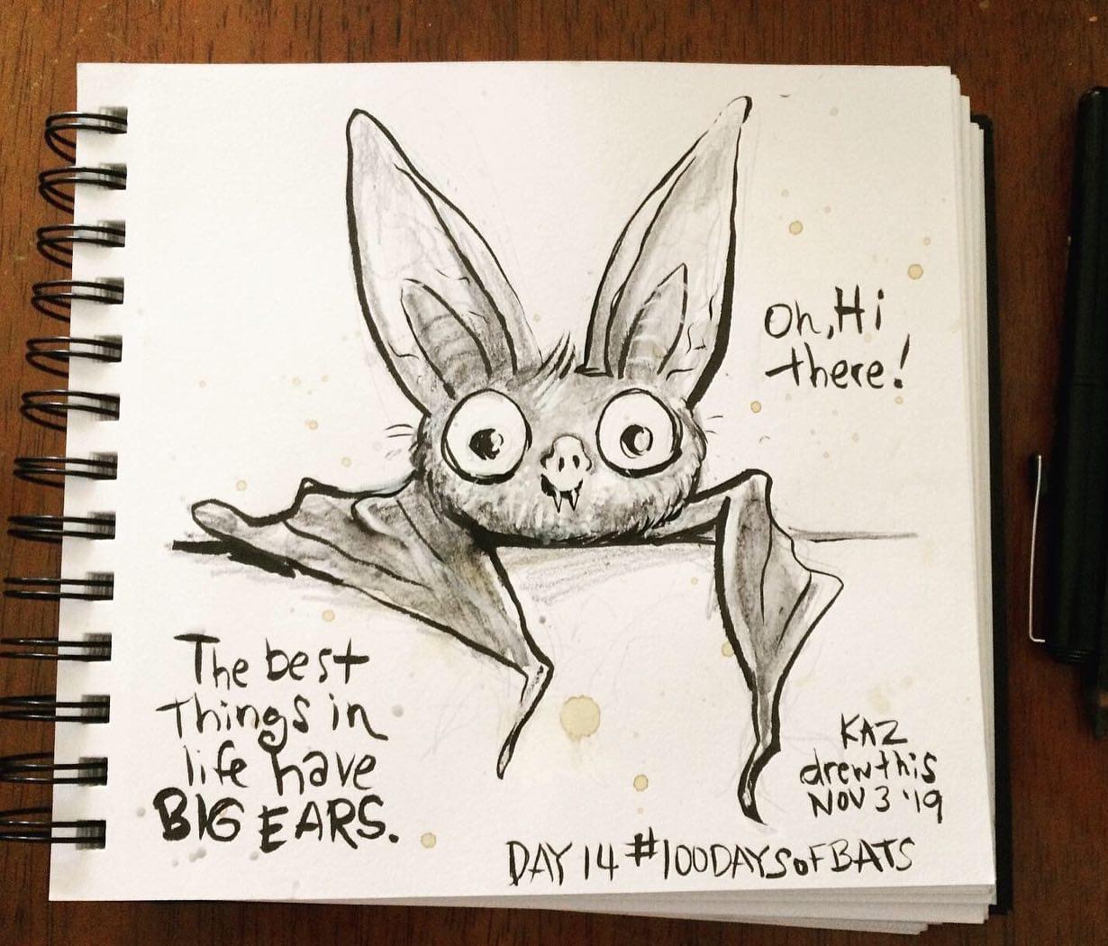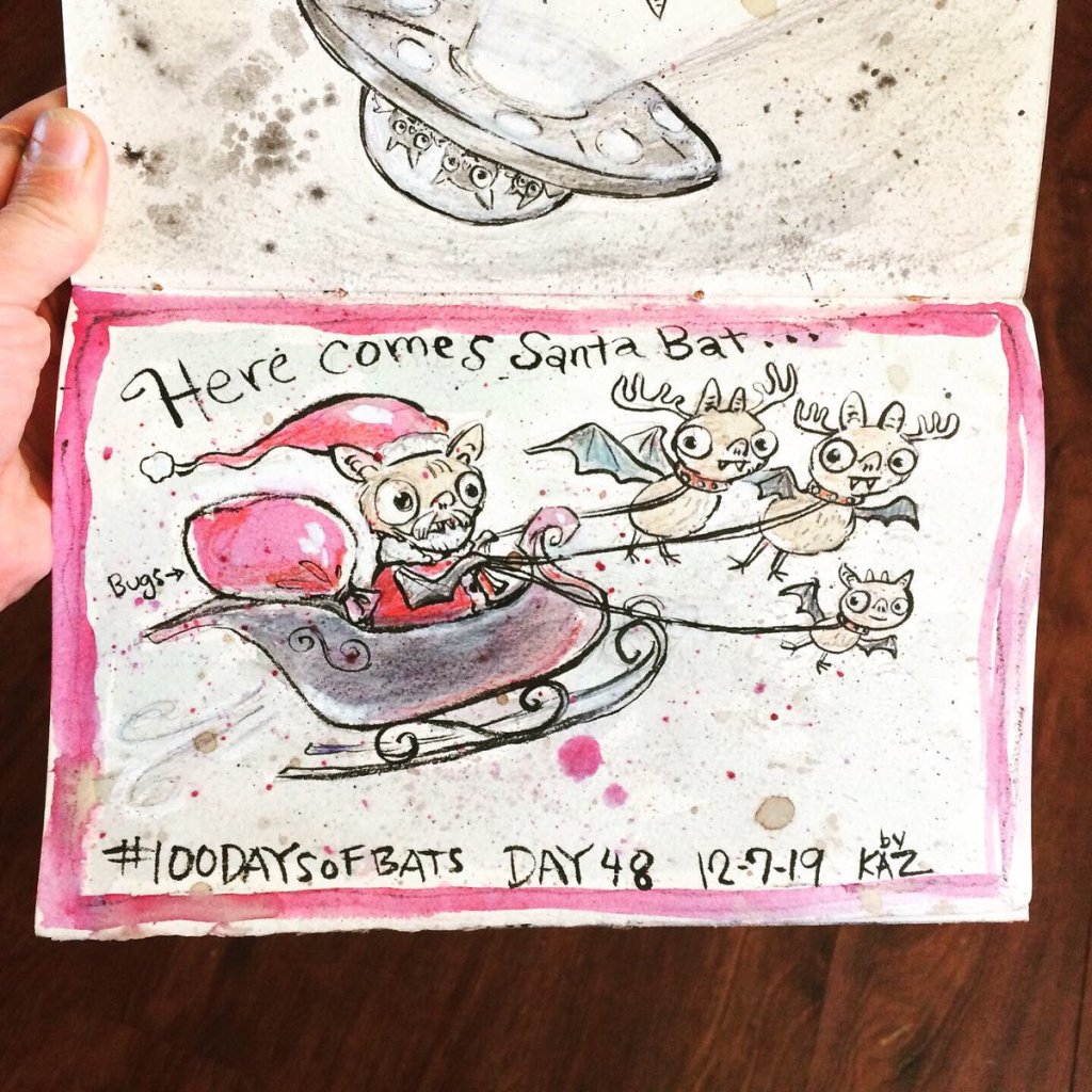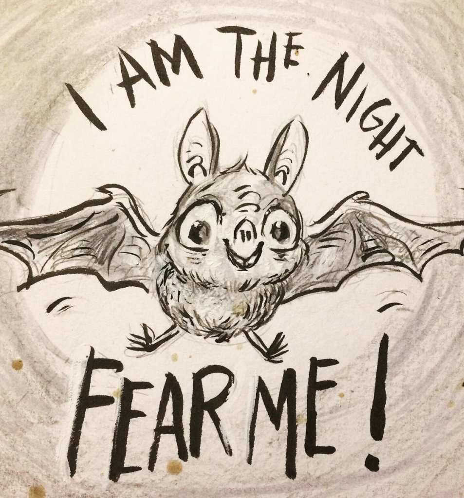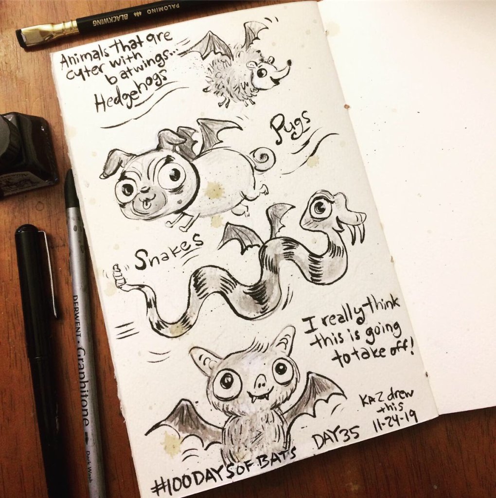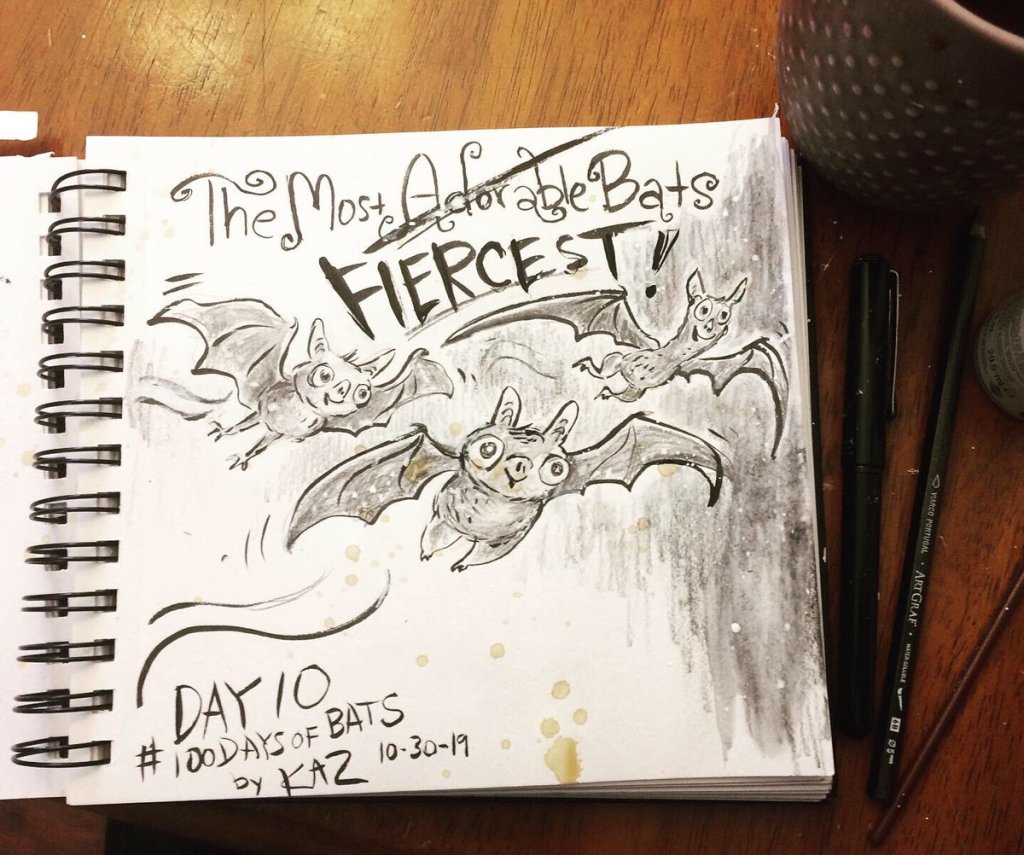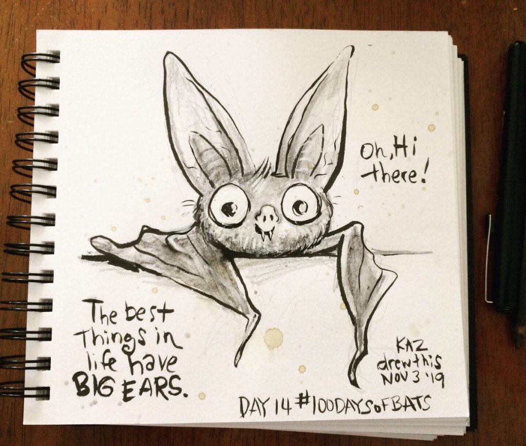 Before the “Bitsy Bat” series, I drew LOTS of bats. Here’s a #100day project I did in 2019-2020 called #100DaysOfBats. Bats are my favorite animal, and I always have ideas for them, but this forced me to dig deep and get creative. What is your favorite? Most of these are ink on Arches watercolor paper.