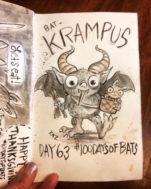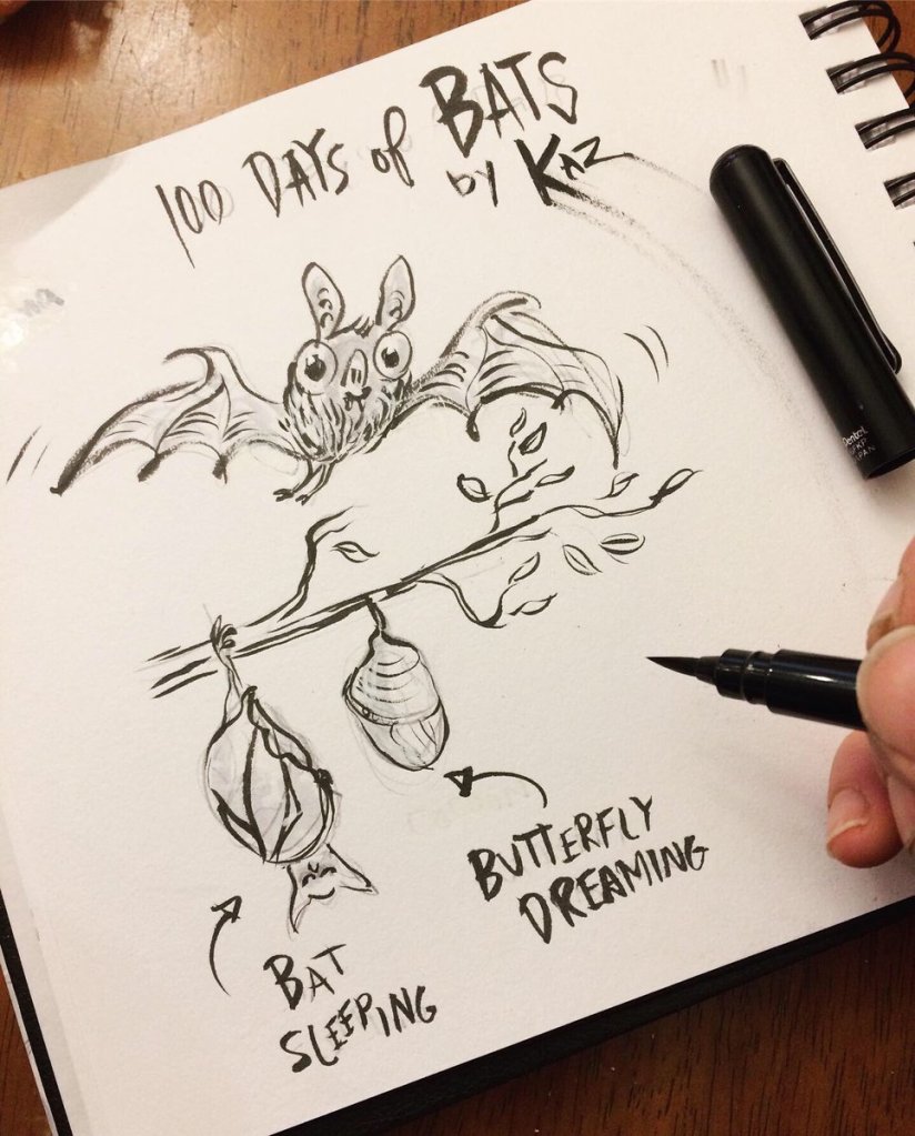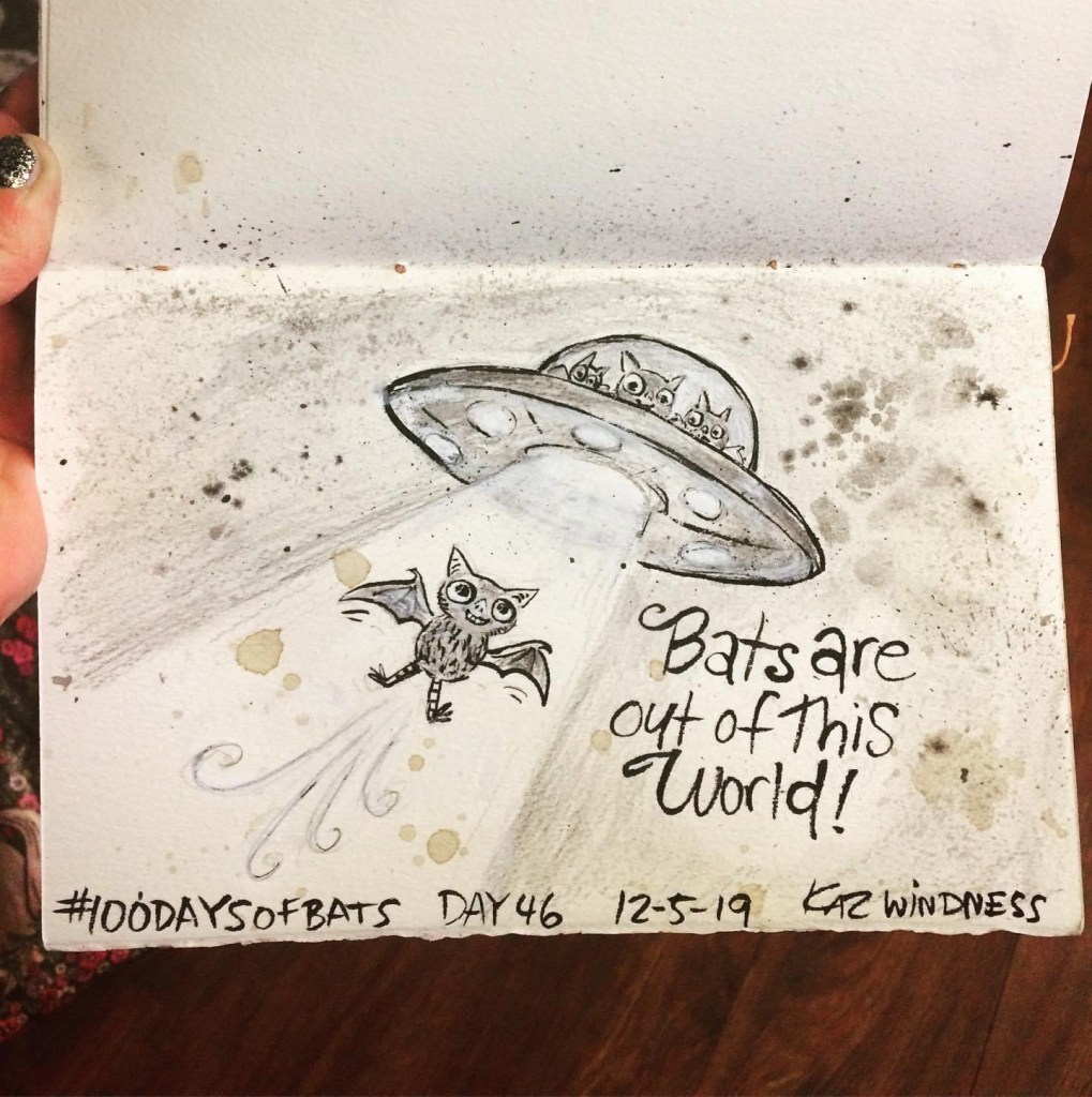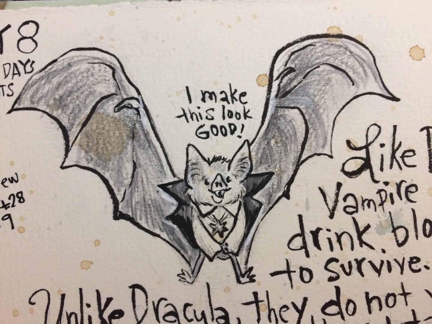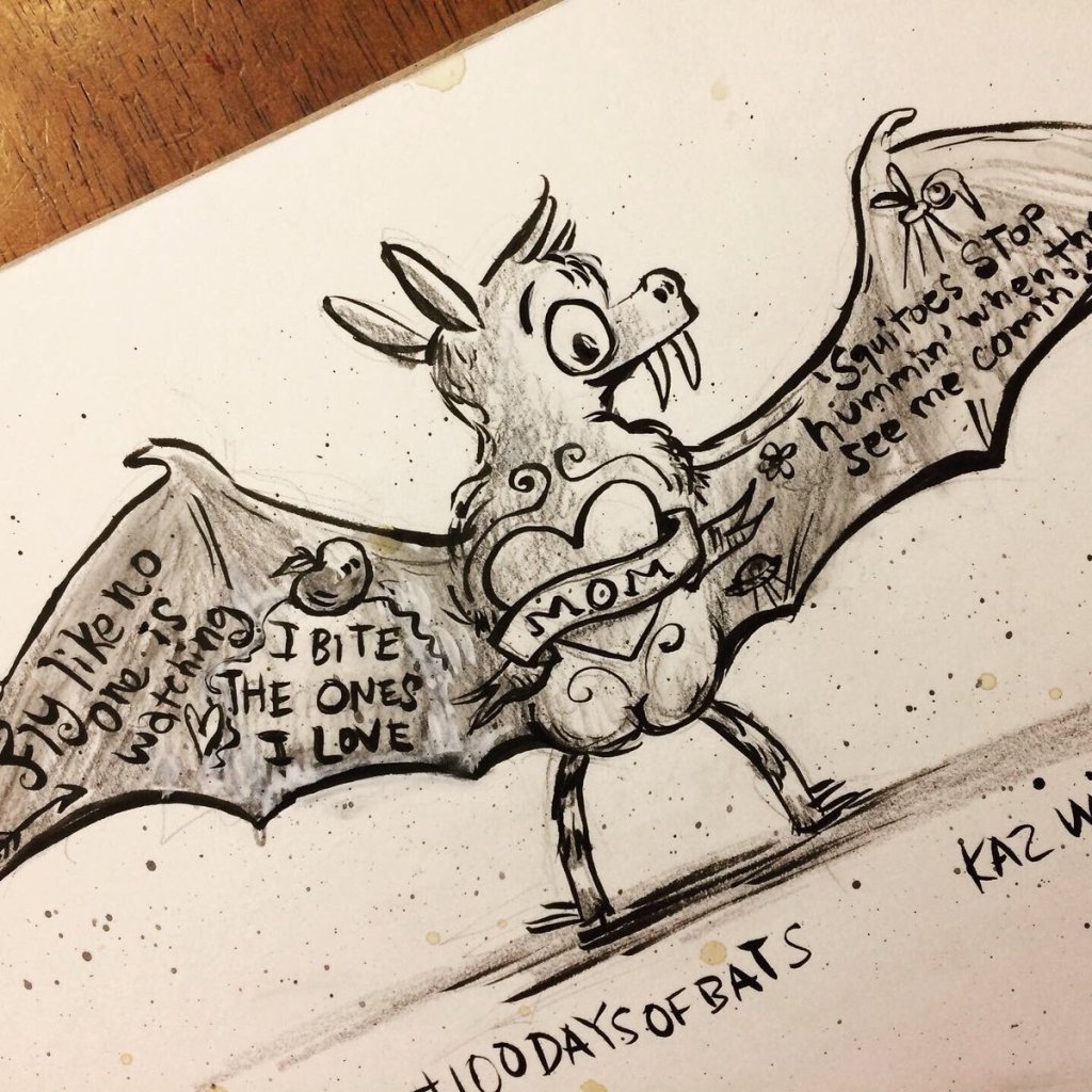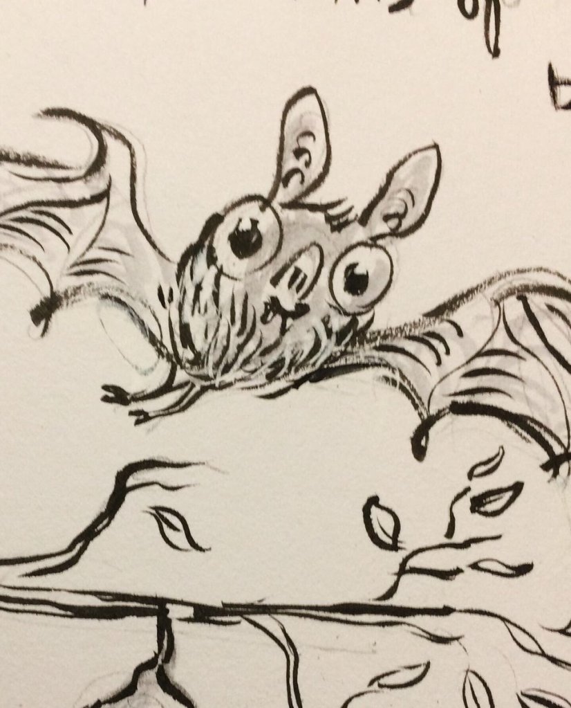 Before the “Bitsy Bat” series, I drew LOTS of bats. Here’s a #100day project I did in 2019-2020 called #100DaysOfBats. Bats are my favorite animal, and I always have ideas for them, but this forced me to dig deep and get creative. What is your favorite? Most of these are ink on Arches watercolor paper.