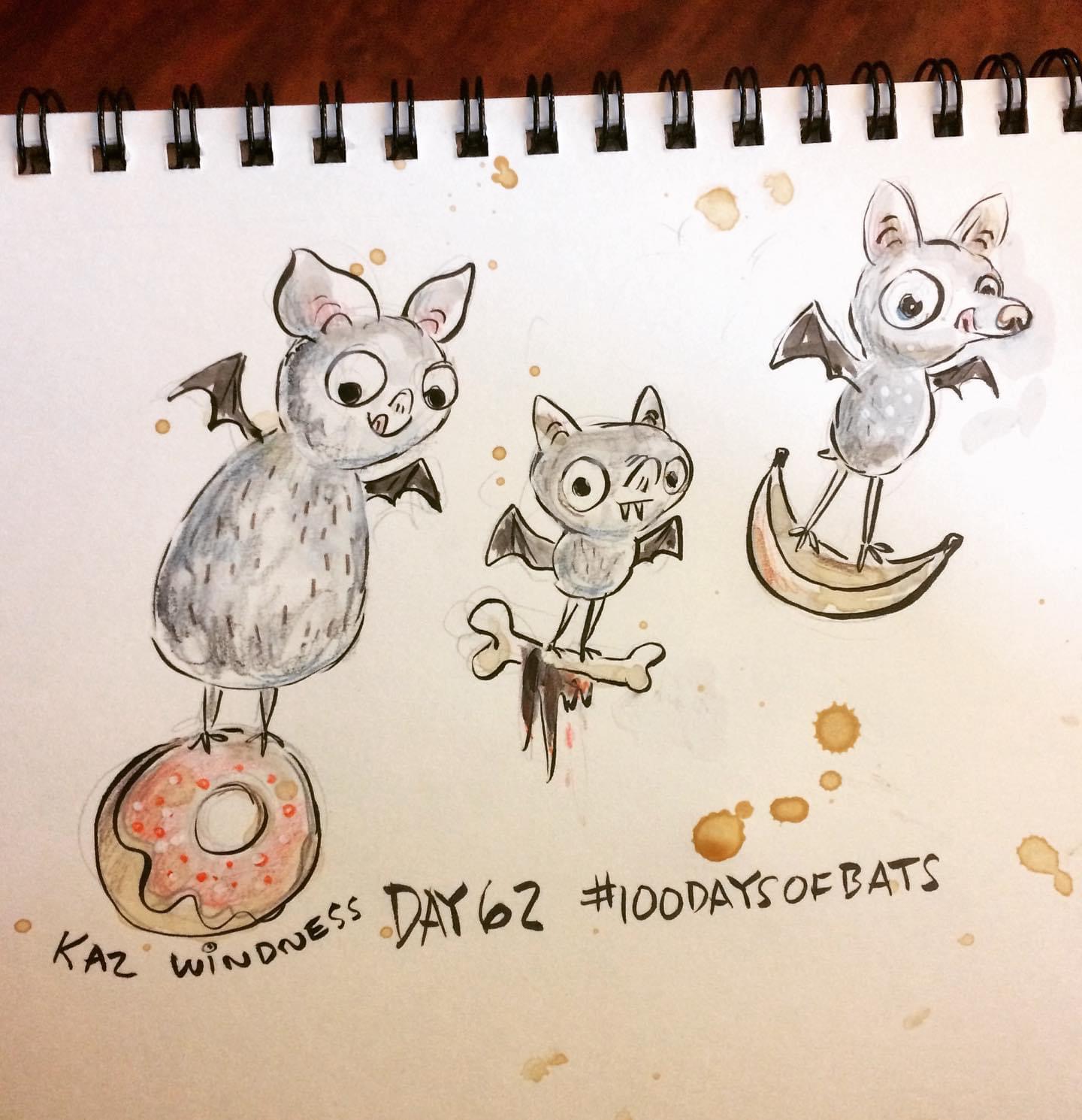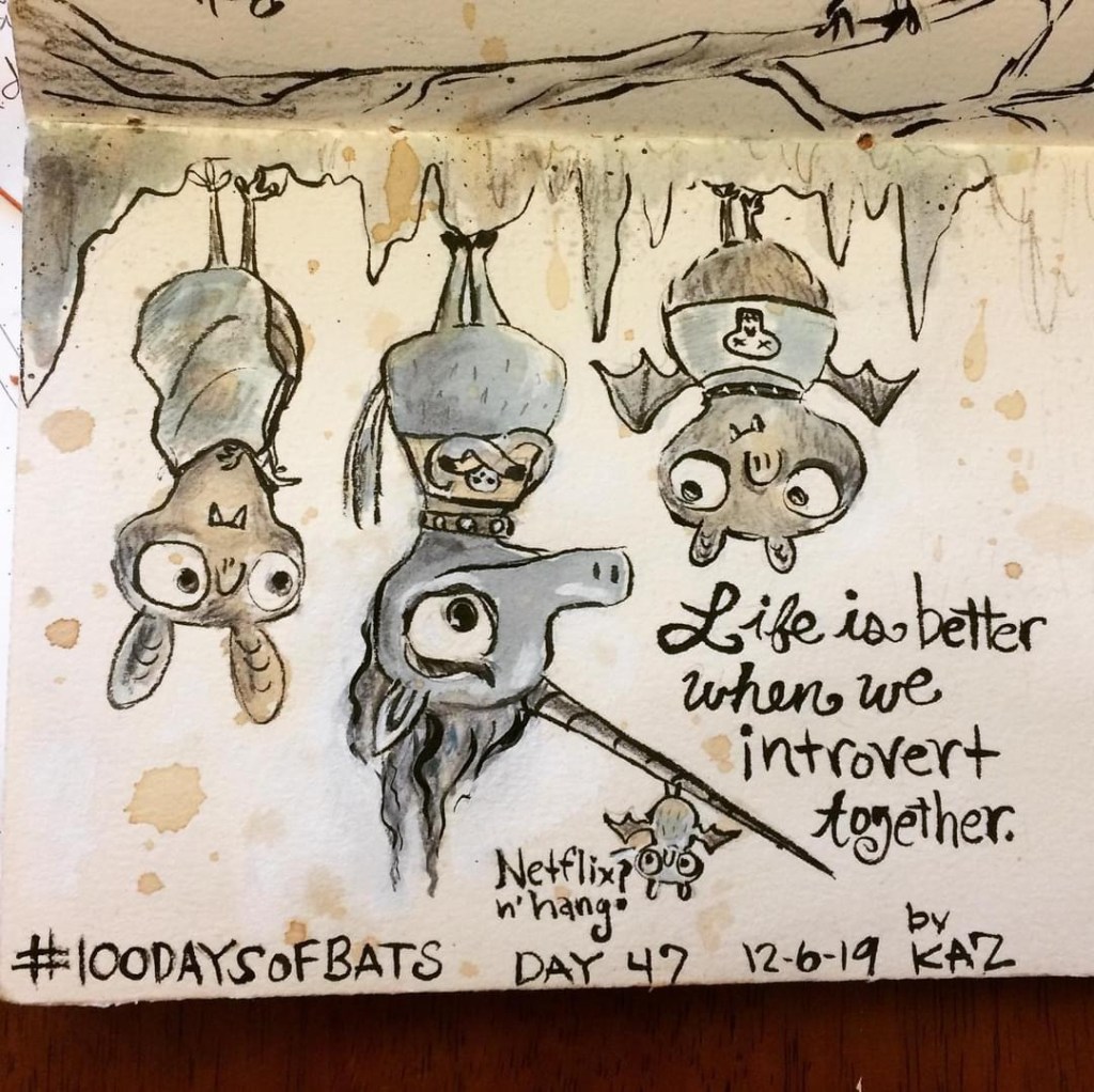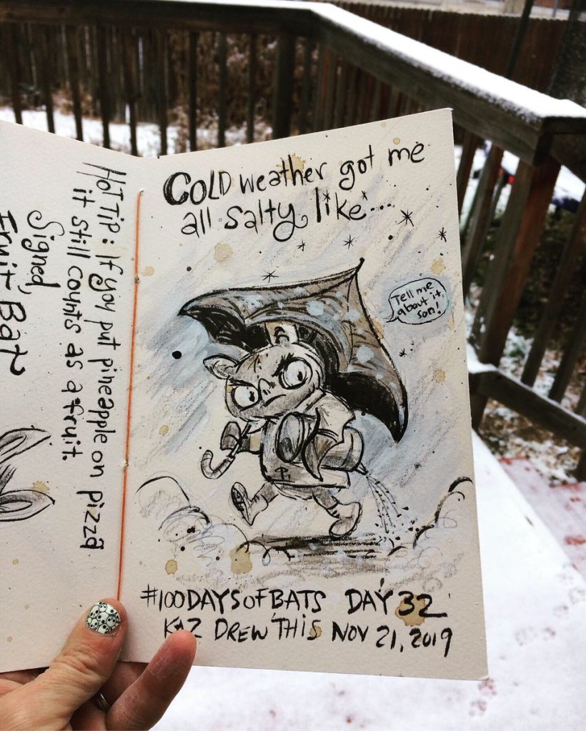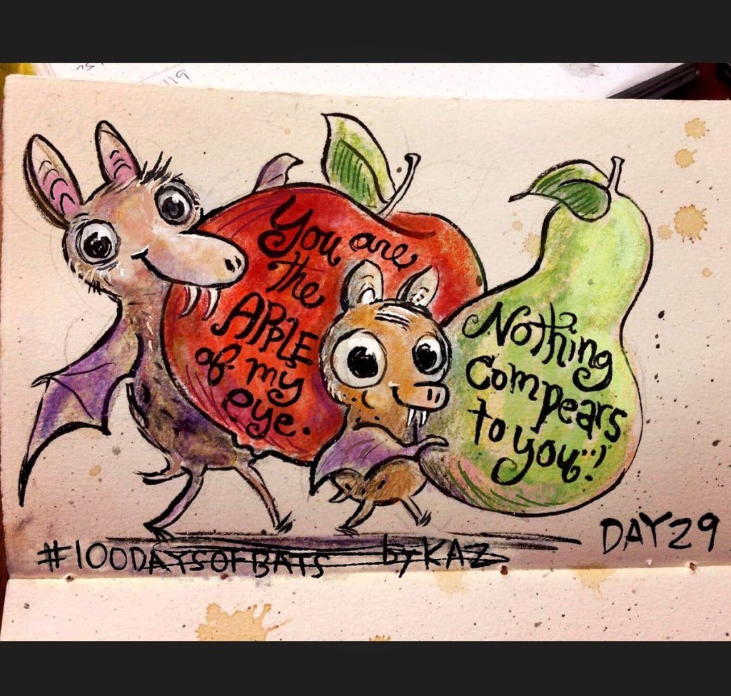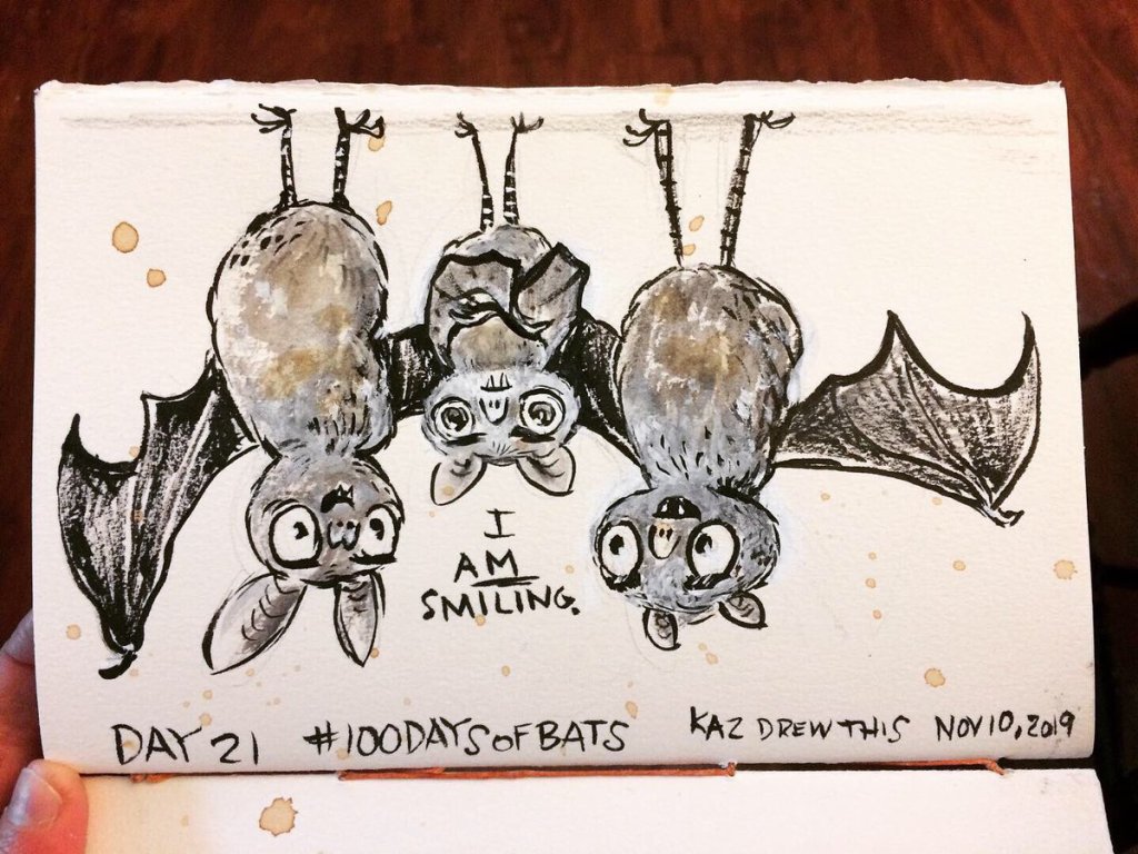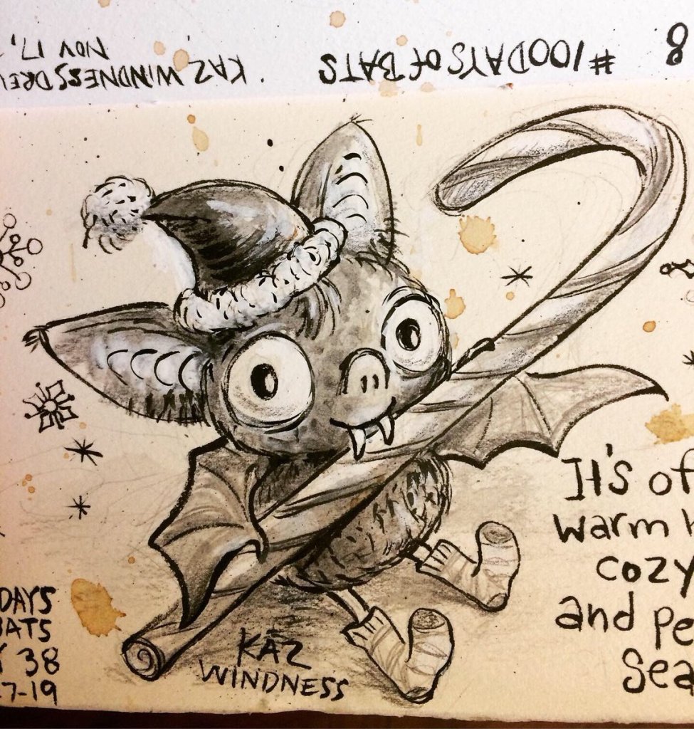 Before the “Bitsy Bat” series, I drew LOTS of bats. Here’s a #100day project I did in 2019-2020 called #100DaysOfBats. Bats are my favorite animal, and I always have ideas for them, but this forced me to dig deep and get creative. What is your favorite? Most of these are ink on Arches watercolor paper.