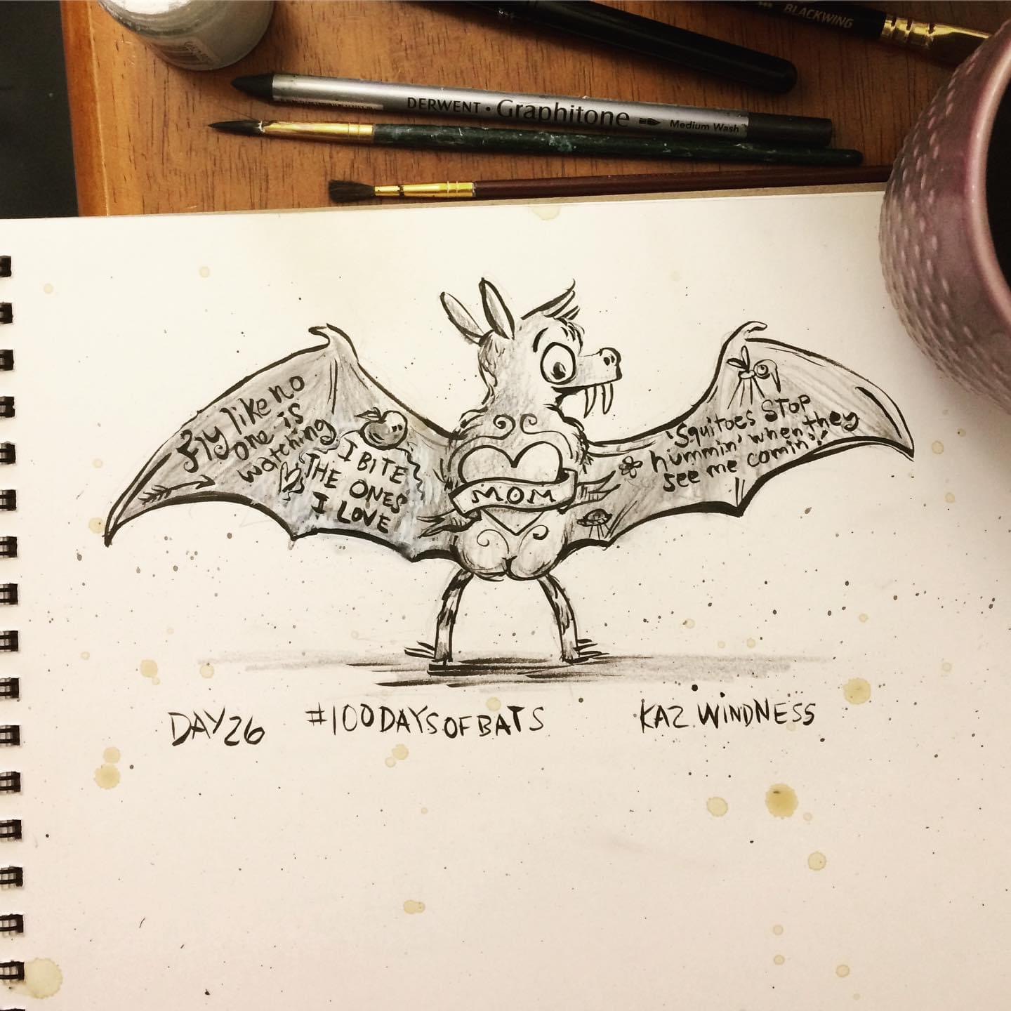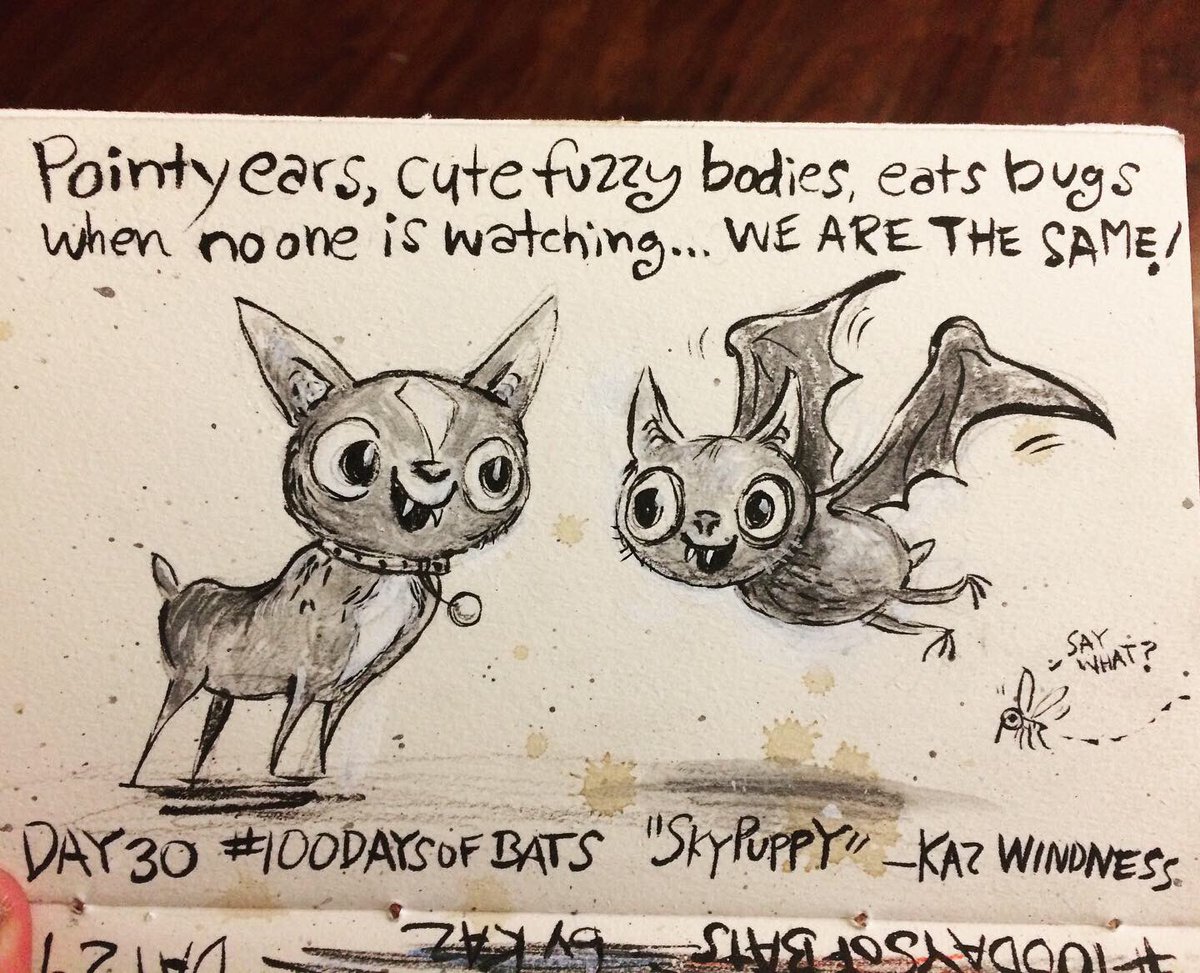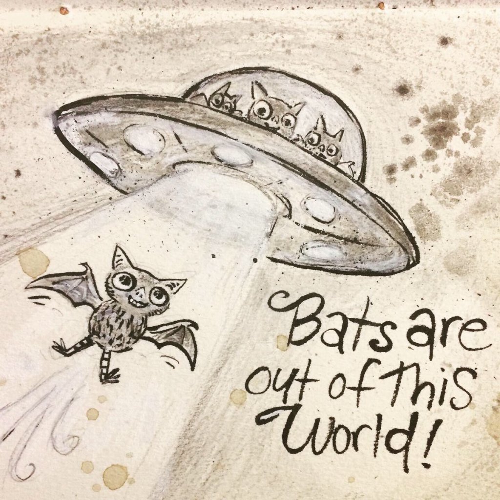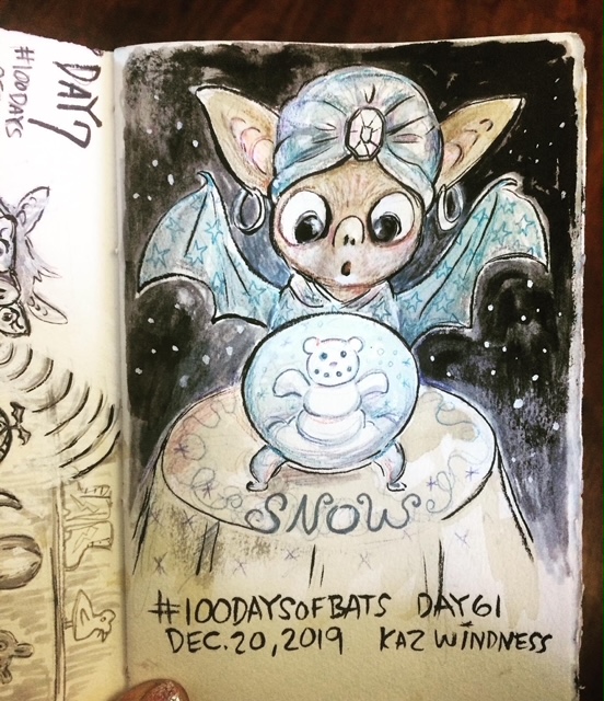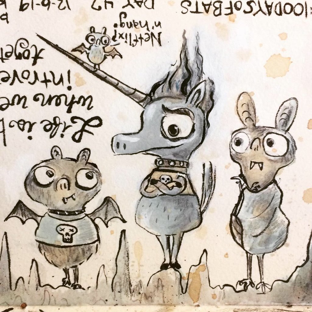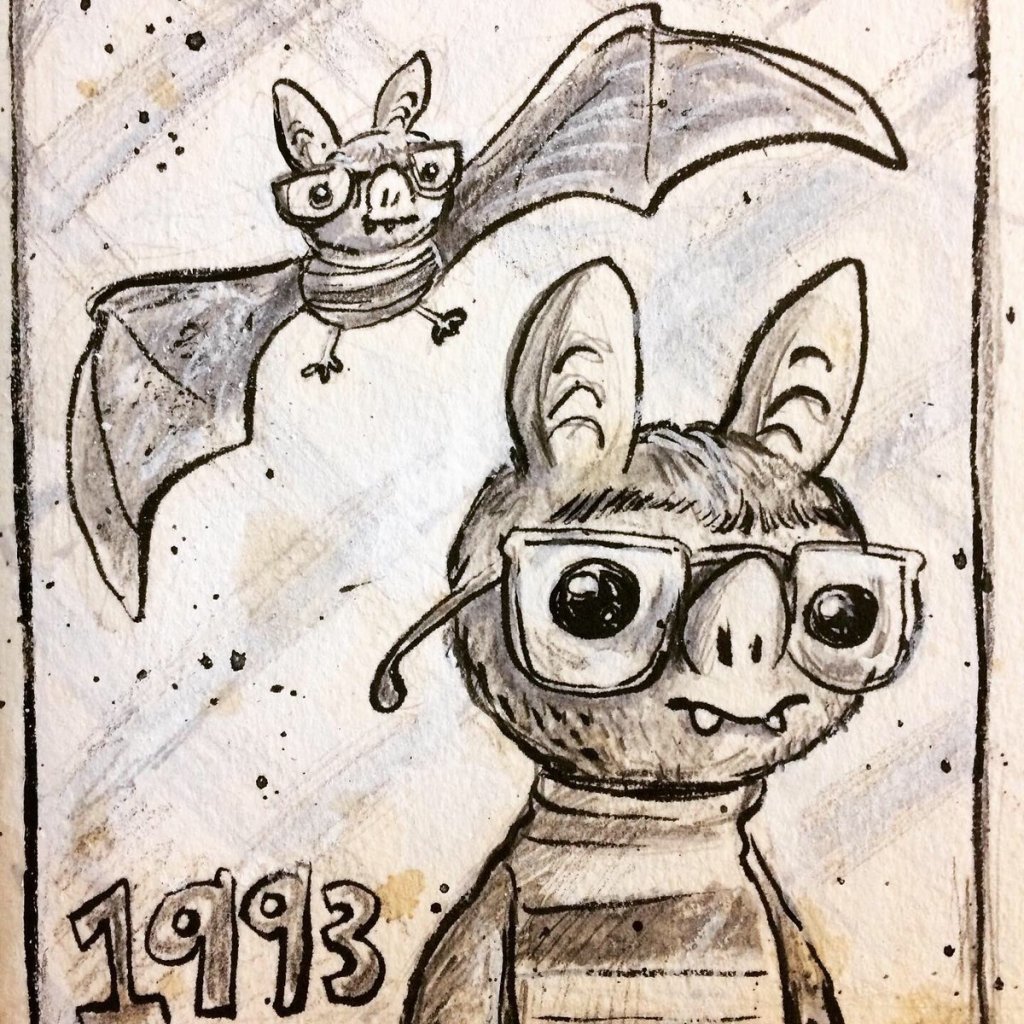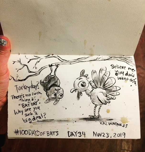 Before the “Bitsy Bat” series, I drew LOTS of bats. Here’s a #100day project I did in 2019-2020 called #100DaysOfBats. Bats are my favorite animal, and I always have ideas for them, but this forced me to dig deep and get creative. What is your favorite? Most of these are ink on Arches watercolor paper.