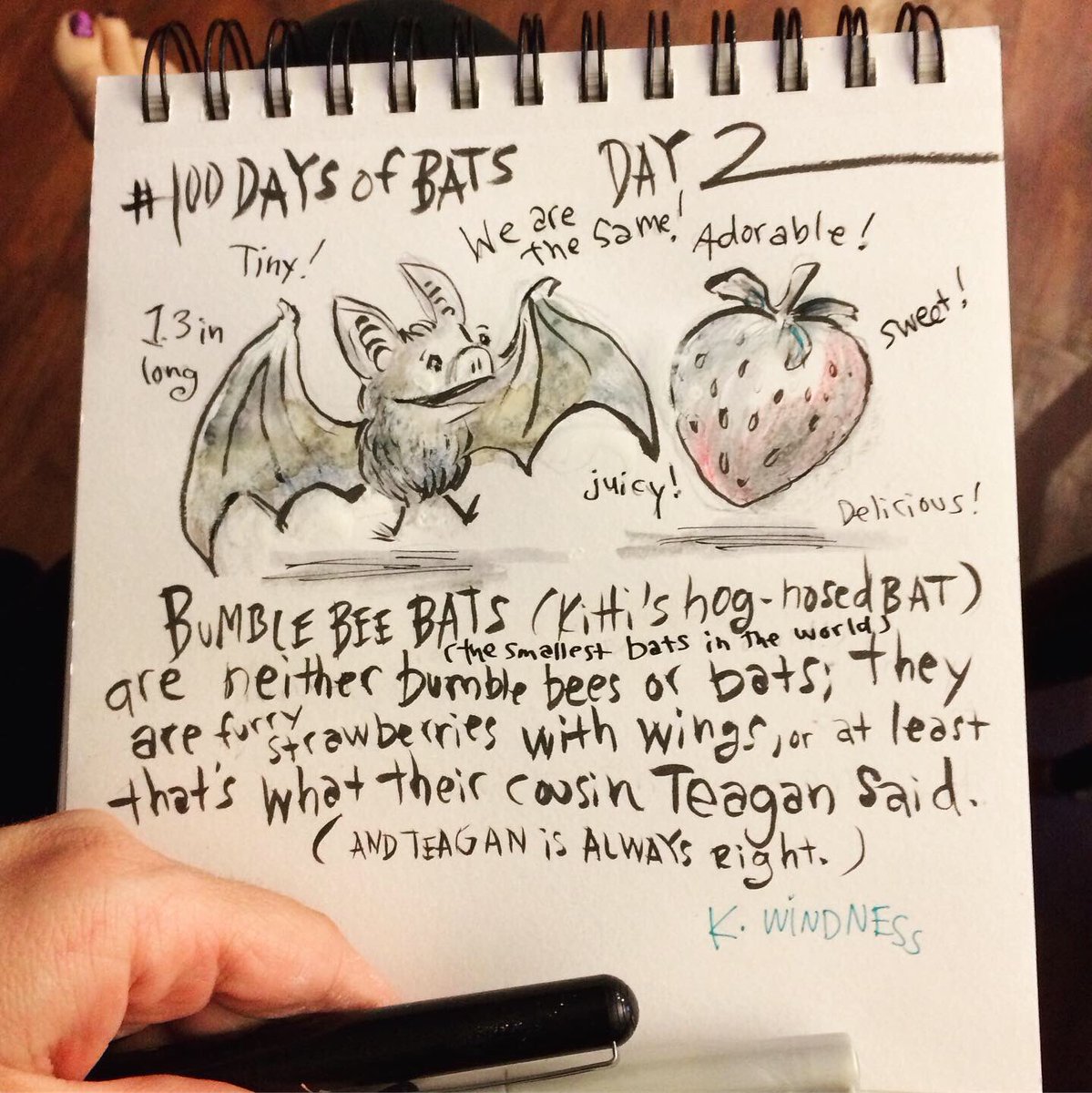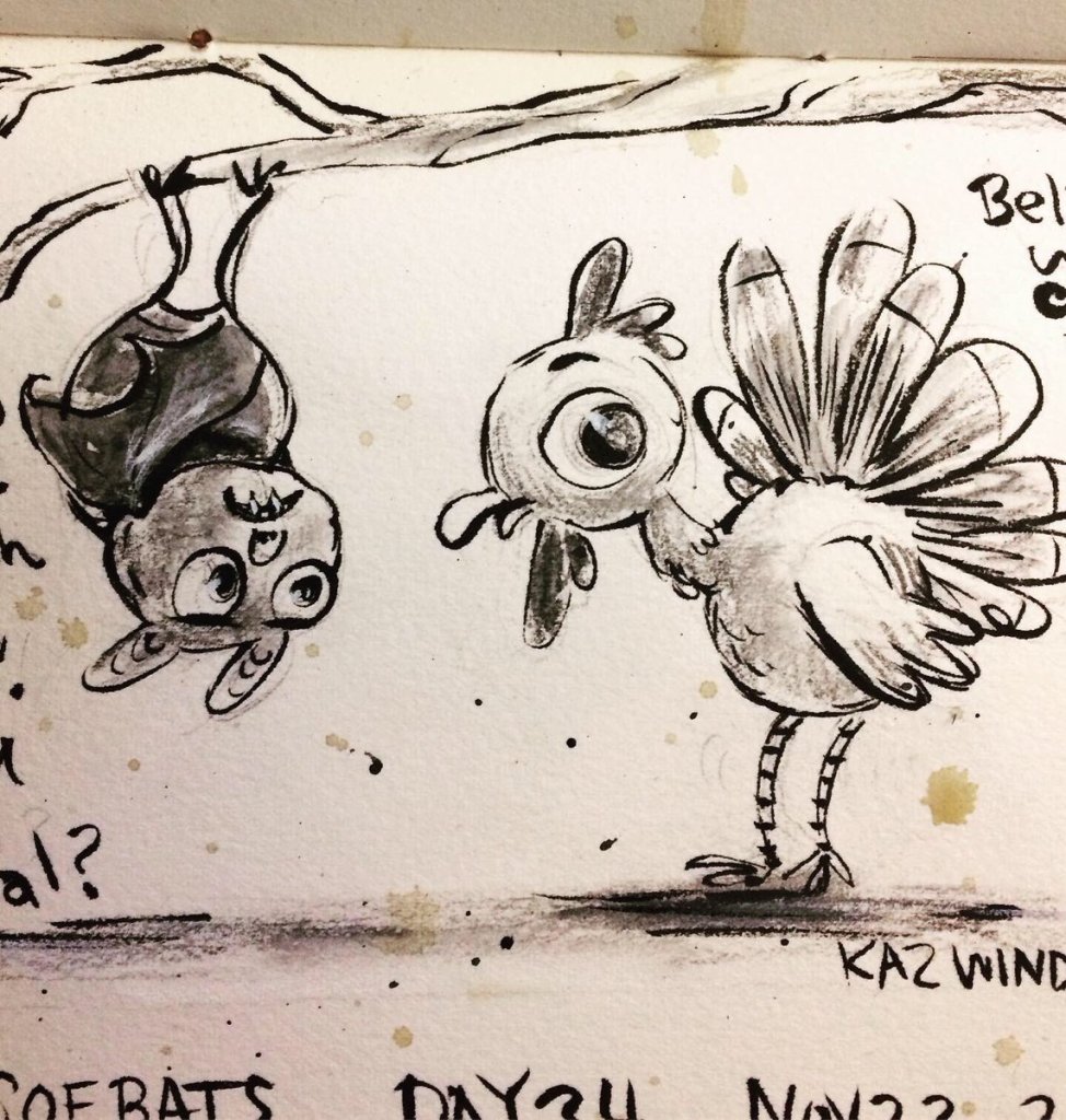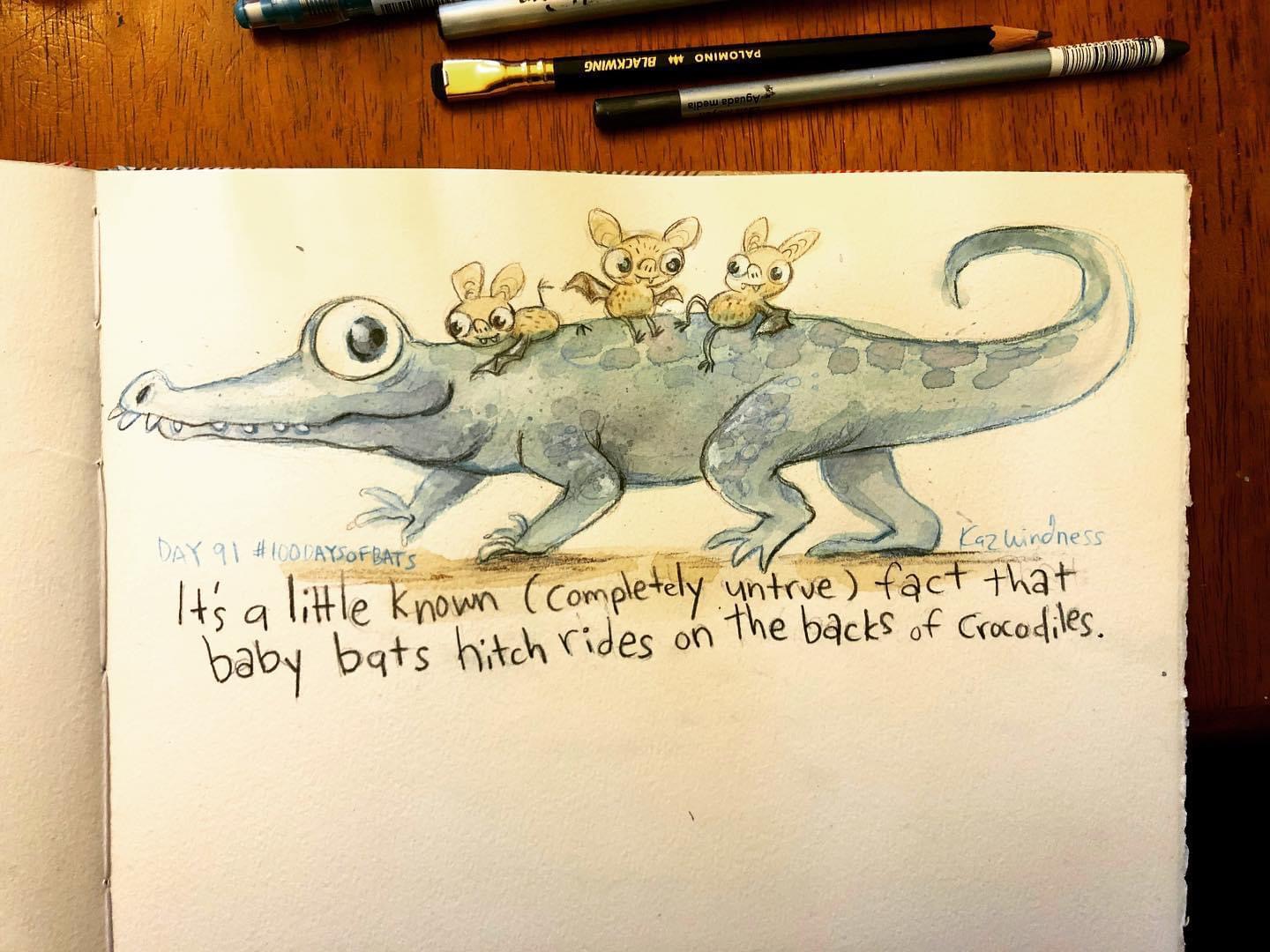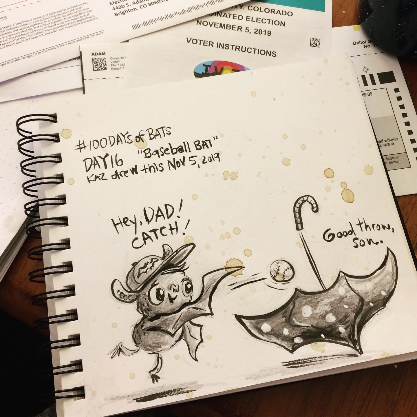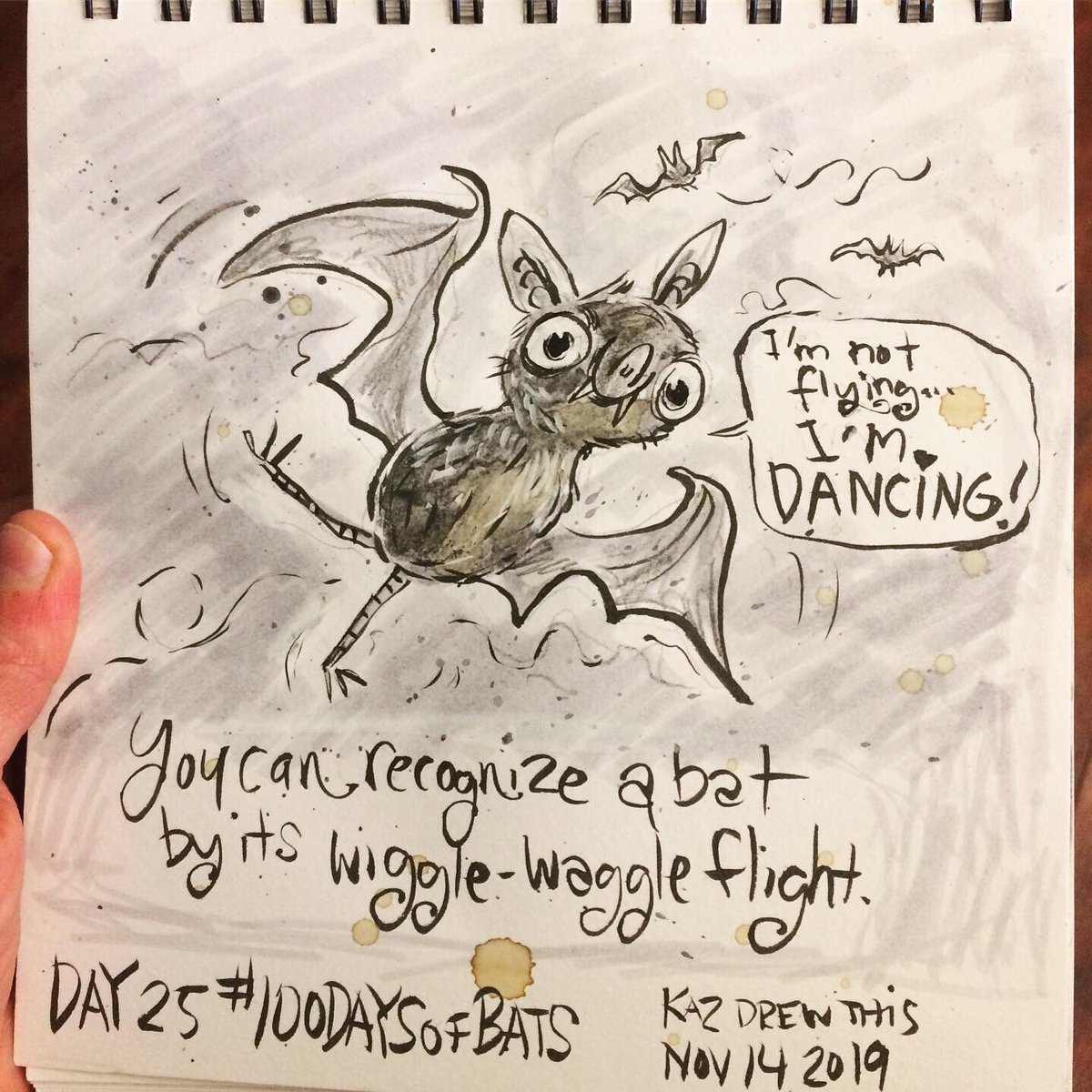 Before the “Bitsy Bat” series, I drew LOTS of bats. Here’s a #100day project I did in 2019-2020 called #100DaysOfBats. Bats are my favorite animal, and I always have ideas for them, but this forced me to dig deep and get creative. What is your favorite? Most of these are ink on Arches watercolor paper.