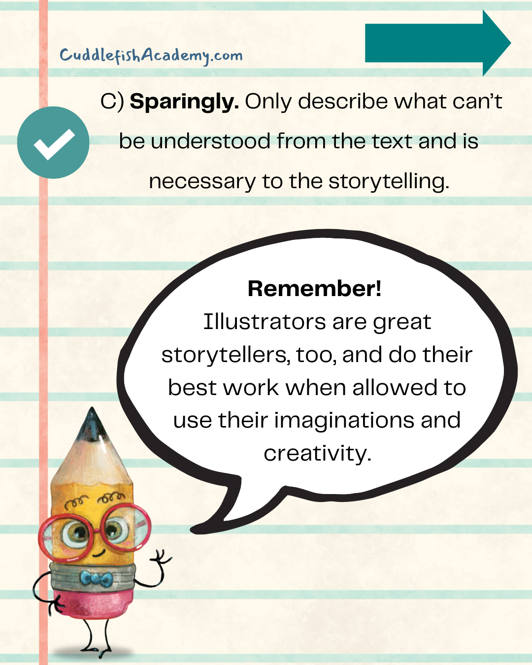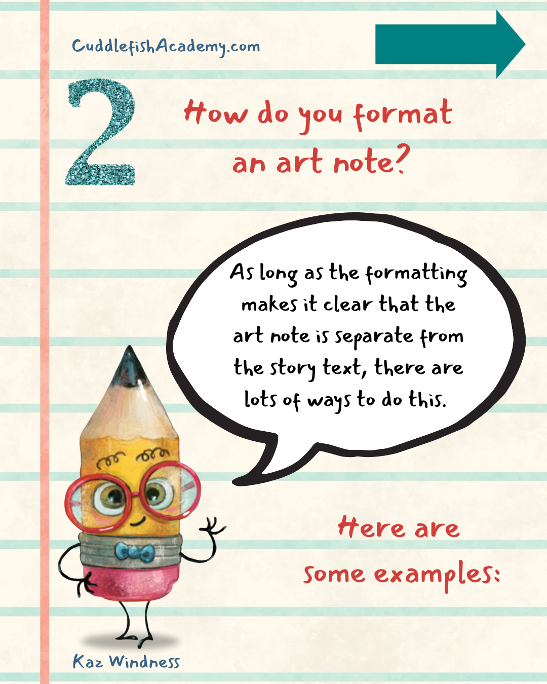 Here’s a fast 5-step guide on using art notes in your picture book and graphic novel manuscripts. We had SO many questions about art notes at the “All About Picture Books” working retreat at Highlights, I created this visual guide for you. Is there anything you would add?