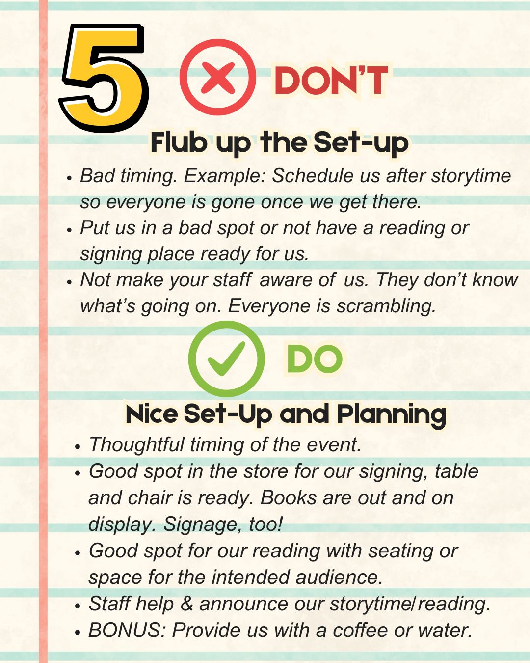 Avoid a disastrous book signing experience! In the last five years, I’ve had my share of amazing and awful book signings, with a lot of events in the middle. I’ve gathered my best tips here to help book stores, authors, and illustrators have the best collaborative experience possible. What else would you add? Comment!