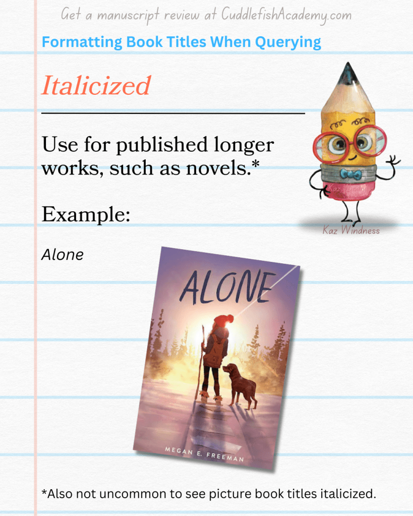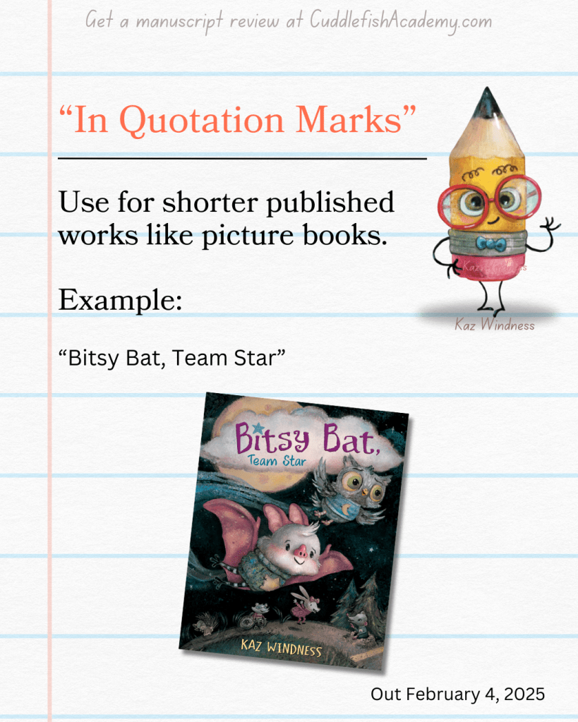 I review a lot of manuscripts and query letters, and often see incorrect formatting for comp titles. Here is a guide for formatting book titles. These are the most common standards and preferences I’ve seen from agents and editors. The “ALL CAPS” for pre-published or querying titles appears to be a #kidlit industry-specific preference. If you are from another industry or have more insights, please comment! And if you need a children’s book manuscript review, sign up for coaching at CuddlefishAcademy.com. You can get a picture book review for as little as 25 US.