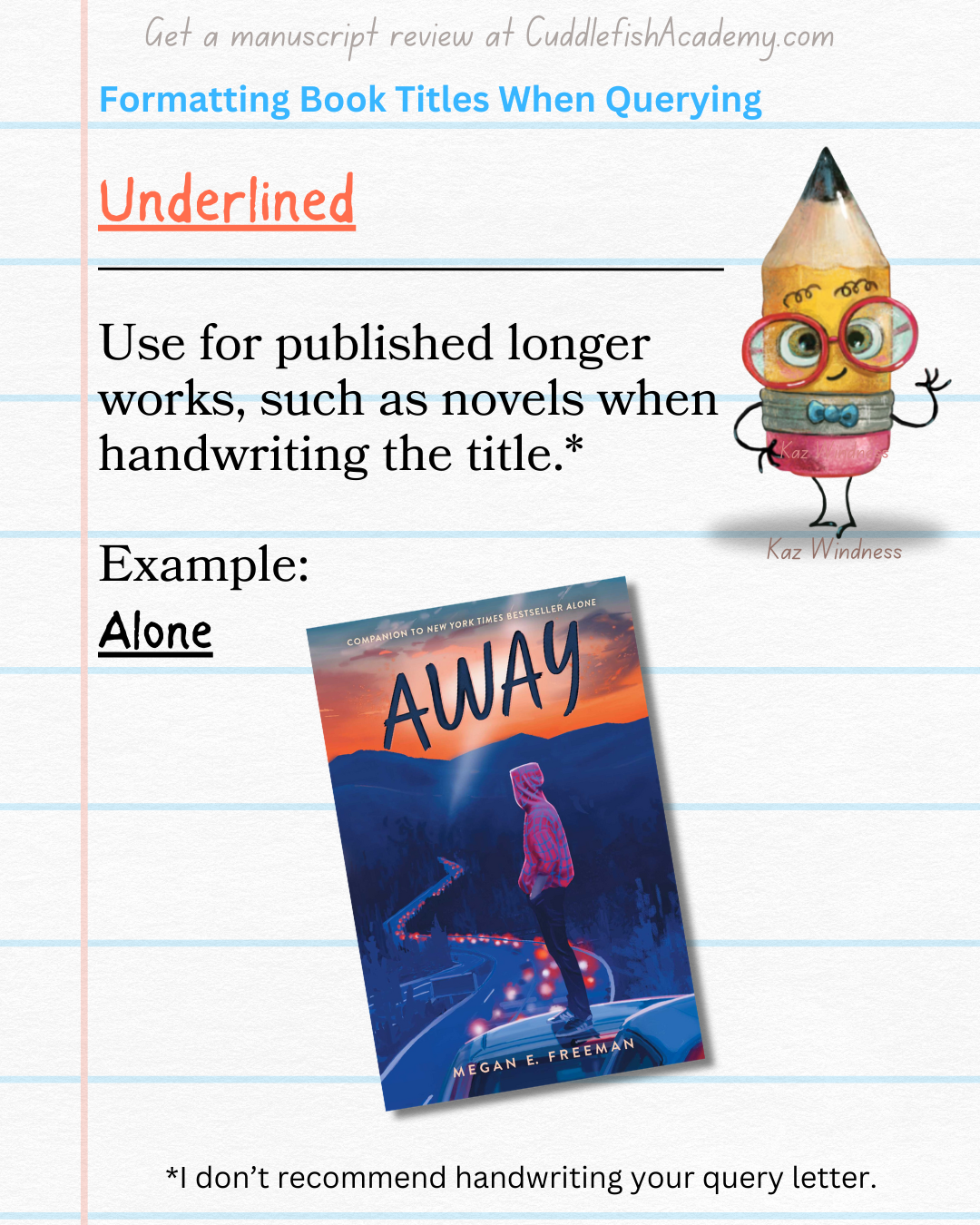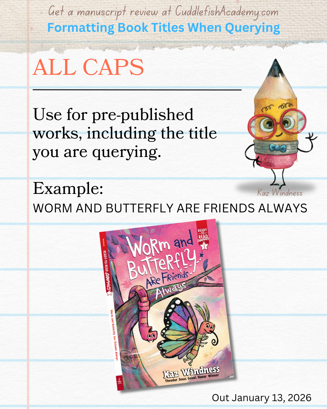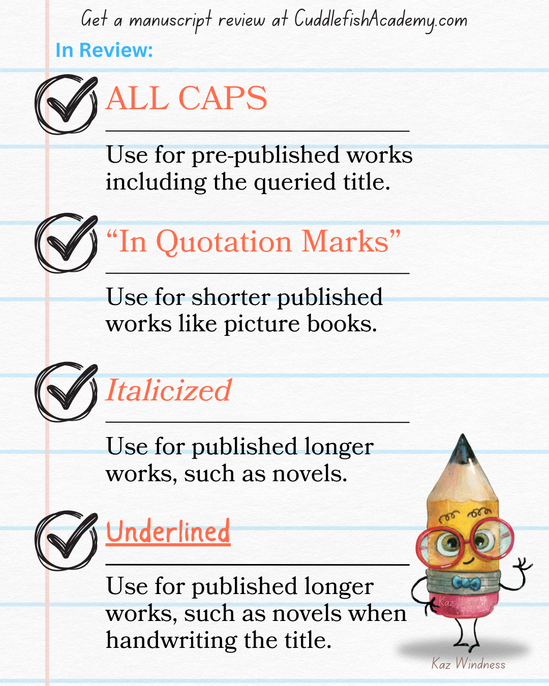 I review a lot of manuscripts and query letters, and often see incorrect formatting for comp titles. Here is a guide for formatting book titles. These are the most common standards and preferences I’ve seen from agents and editors. The “ALL CAPS” for pre-published or querying titles appears to be a #kidlit industry-specific preference. If you are from another industry or have more insights, please comment! And if you need a children’s book manuscript review, sign up for coaching at CuddlefishAcademy.com. You can get a picture book review for as little as 25 US.