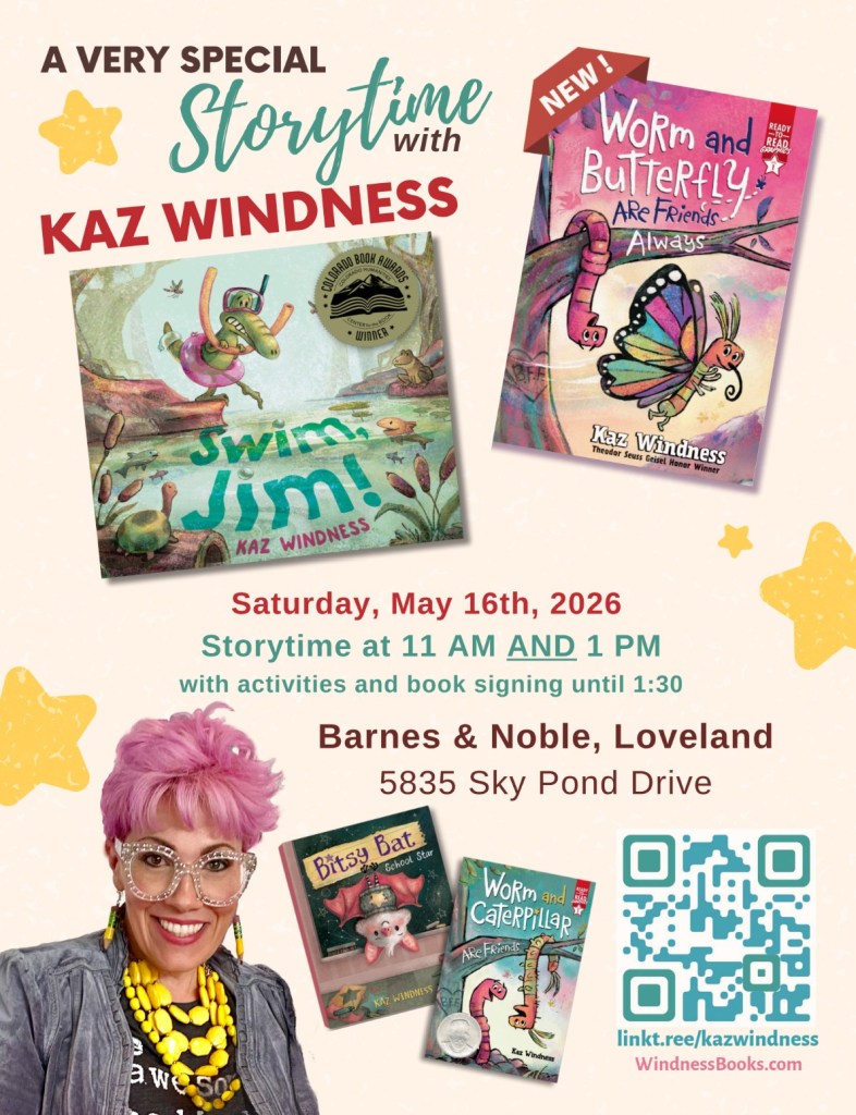Mark your calendars and come join me for a very special storytime on May 16th. I’ll be reading my Colorado Book Award Winner, “Swim, Jim!”, and my newest release, “Worm and Butterfly are Friends Always,” the follow-up to my Dr. Seuss Geisel Honor Award-winning “Worm and Butterfly are Friends.” “Bitsy Bat, School Star” will also be available for the signing. Activities and fun for the whole family!